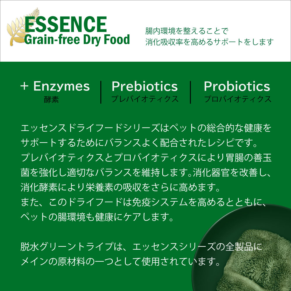 | 原材料 | オーストラリア産サーモン、ホルモン不使用チキン、グリーントライプ、サツマイモ、鶏脂、エンドウ豆、ナチュラルフレーバー、カボチャ、ほうれん草、ブロッコリー、リンゴ、クランベリー、ウコン、緑イ貝、塩化アンモニウム、塩化カリウム、ビタミン・ミネラル類( ビタミン A、D、E、K、B1、B2、B3、B5、B6、B12、葉酸、ビオチン、塩化コリン、クエン酸、タウリン、硫酸亜鉛、硫酸鉄、キレート亜鉛、硫酸銅 、酸化マンガン、ヨウ素、セレン)、塩化コリン、プレバイオティクス(フラクトオリゴ糖( FOS)、マンナンオリゴ糖(MOS))、ライトミネラルオイル、ユッカシジゲラエキス、L-リジン、酵素(アミラーゼ、プロテアーゼ)、プロバイオティクス(枯草菌)、DL-メチオニン、ミックストコフェロール、ローズマリーエキス。 |
