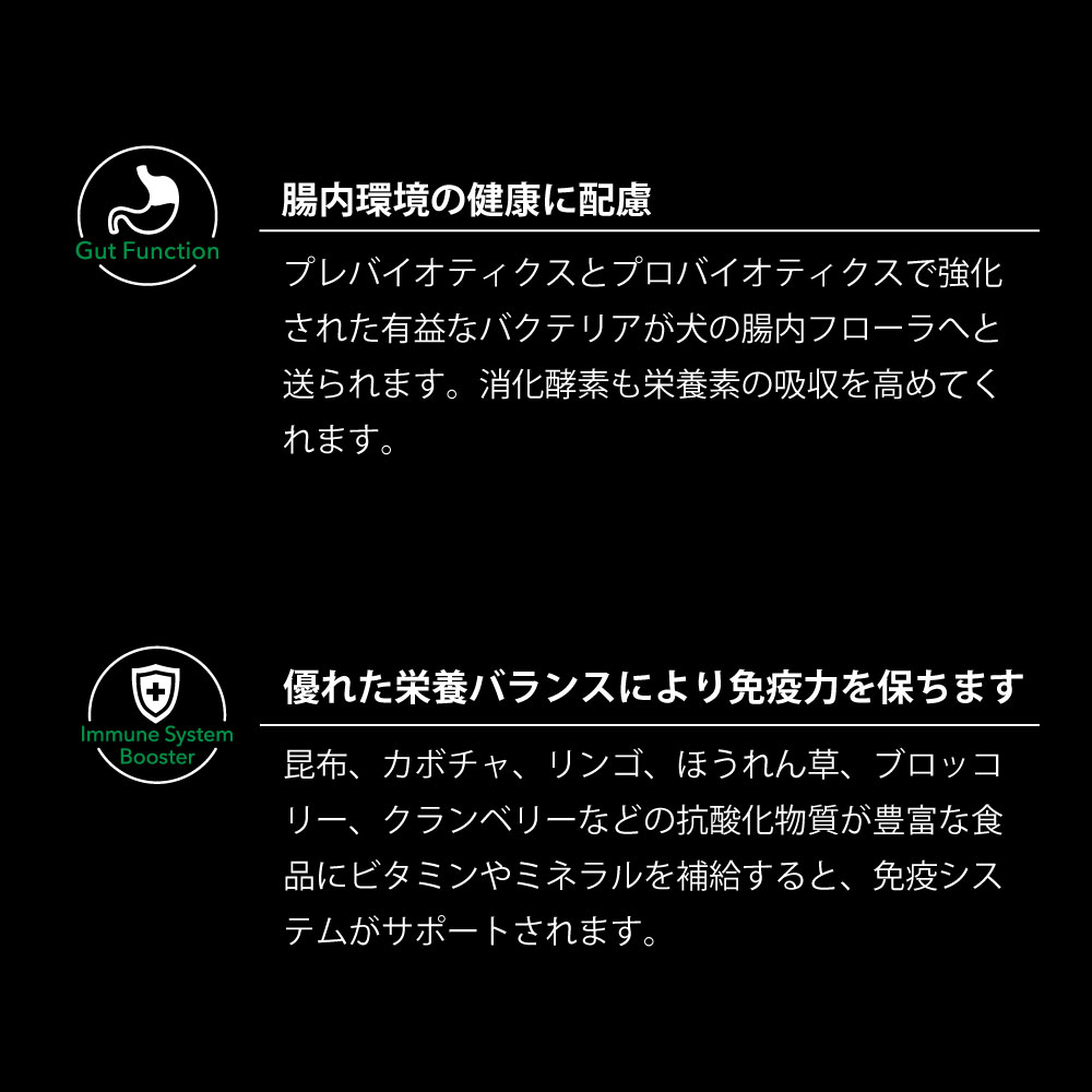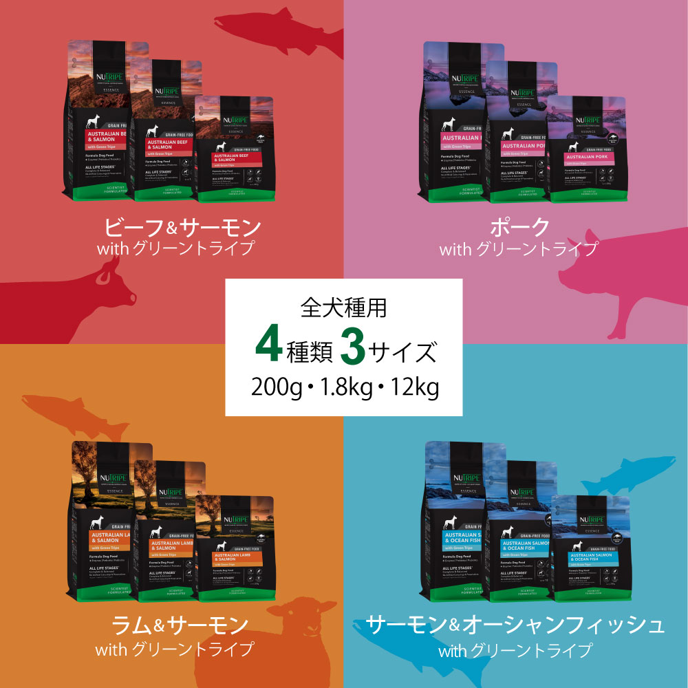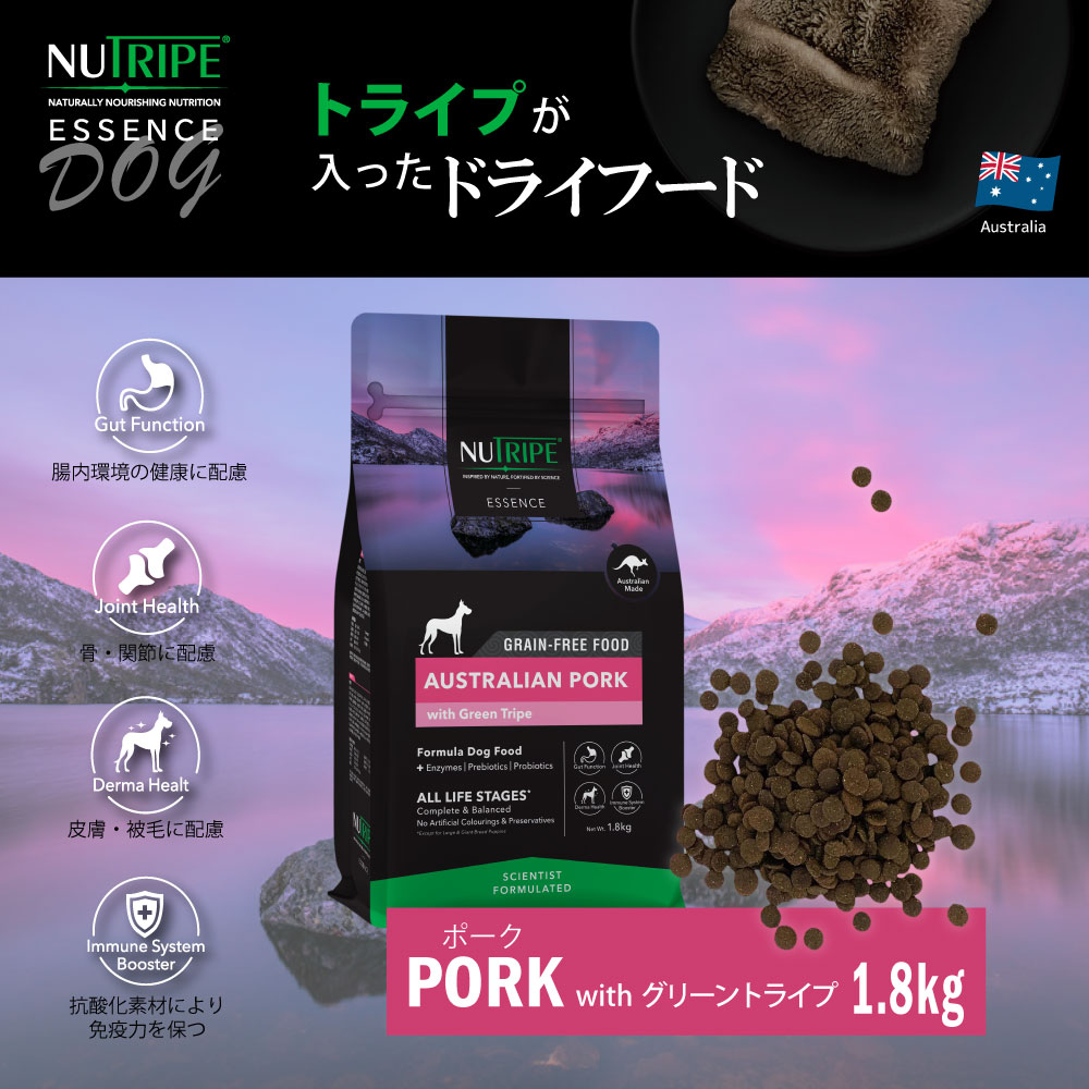 | 原材料 | オーストラリア産ポーク、グリーントライプ、サツマイモ、鶏脂、ナチュラルフレーバー、サーモンオイル、パンプキン、ほうれん草、ブロッコリー、リンゴ、クランベリー、ウコン、塩化カリウム、緑イ貝、ビタミン・ミネラル類(ビタミン A、D、E、K、B1、B2、B3、B5、B6、B12、葉酸、ビオチン、クエン酸、硫酸亜鉛、硫酸鉄、キレート亜鉛、キレート鉄、硫酸銅、酸化マンガン、キレート銅、キレートマンガン、ヨウ素、セレン)、塩化コリン、プレバイオティクス(フラクトオリゴ糖(FOS)、マンナンオリゴ糖(MOS))、タウリン、ケルプ、ユッカシジゲラエキス、L-リジン、酵素(アミラーゼ、プロテアーゼ)、プロバイオティクス(枯草菌)、DL-メチオニン、酸化マグネシウム、ミックストコフェロール、ローズマリーエキス |