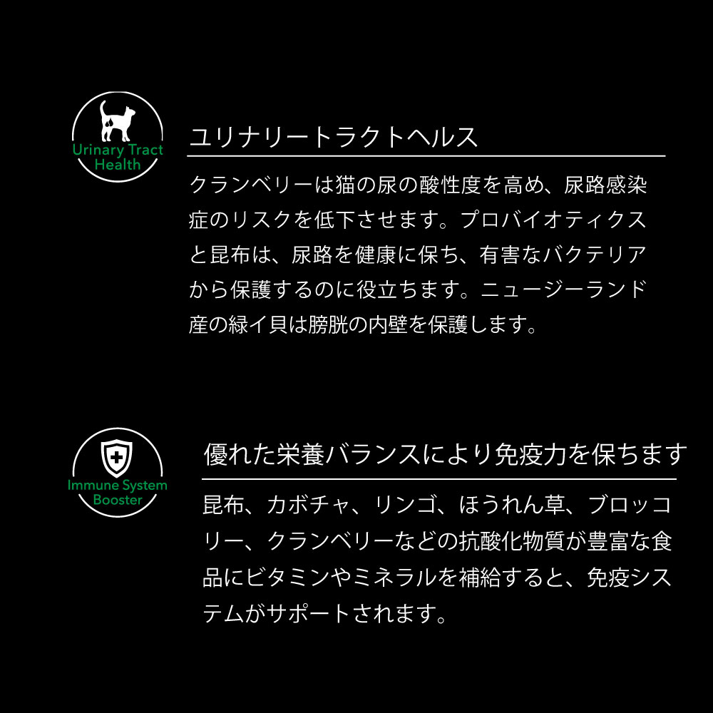 | 原材料 | オーストラリア産サーモン、ホルモン不使用チキン、グリーントライプ、サツマイモ、鶏脂、エンドウ豆、ナチュラルフレーバー、カボチャ、ほうれん草、ブロッコリー、リンゴ、クランベリー、ウコン、緑イ貝、塩化アンモニウム、塩化カリウム、ビタミン・ミネラル類( ビタミン A、D、E、K、B1、B2、B3、B5、B6、B12、葉酸、ビオチン、塩化コリン、クエン酸、タウリン、硫酸亜鉛、硫酸鉄、キレート亜鉛、硫酸銅 、酸化マンガン、ヨウ素、セレン)、塩化コリン、プレバイオティクス(フラクトオリゴ糖( FOS)、マンナンオリゴ糖(MOS))、ライトミネラルオイル、ユッカシジゲラエキス、L-リジン、酵素(アミラーゼ、プロテアーゼ)、プロバイオティクス(枯草菌)、DL-メチオニン、ミックストコフェロール、ローズマリーエキス。 |