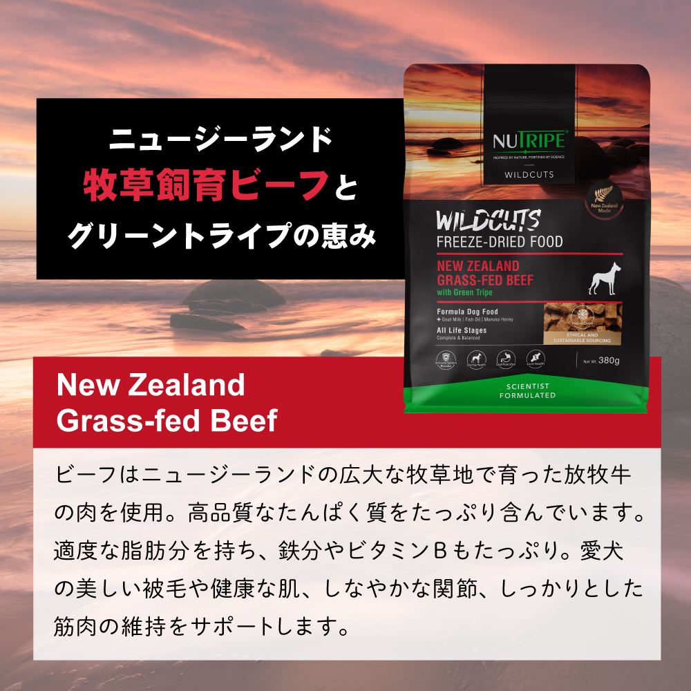 ワイルドカットフリーズドライシリーズは、非常に高い嗜好性と栄養価のあるオールライフステージのグレインフリー総合栄養食です。「ワイルドカットフリーズドライ」は栄養素を保持し最高の安全基準を維持するフリーズドライ製法とコールドプレス技術を組み合わせています。ワイルドカット=ホールプレイ(丸ごと捕食)の食事に着想を得ており、愛犬の自然な食事のニーズに沿った栄養豊富レシピを提供します。「ビーフwithグリーントライプ」は、ニュージーランドの牧草地で放牧されている牛の肉で構成される動物性タンパク質源のブレンドです。牛肉はタンパク質が豊富で、脂肪分が多く、鉄分とビタミンBが豊富で、健康な被毛、肌、関節、筋肉をサポートします。