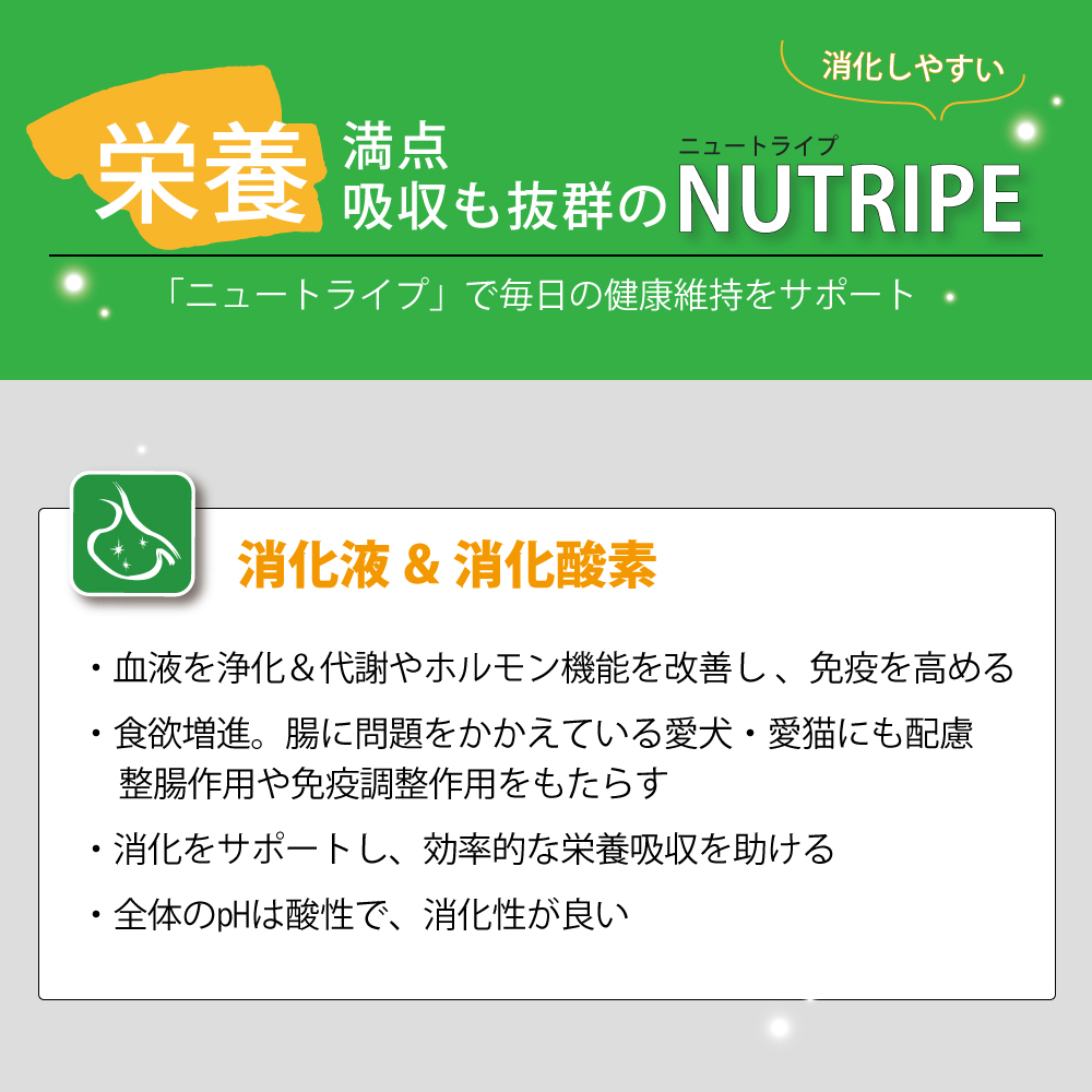 | ※フードの切り替え方法:はじめは現在のフード3/4、Nutripe1/4を混ぜて与えてください。 | |