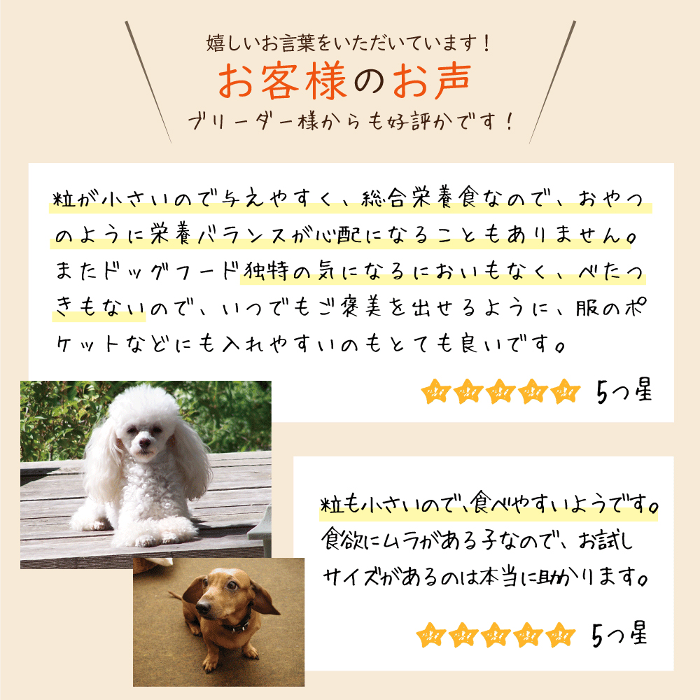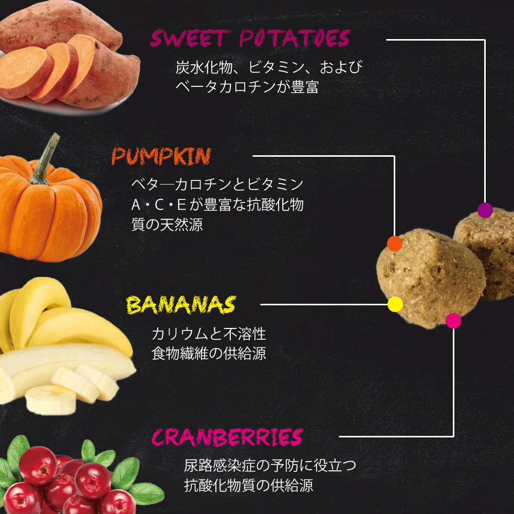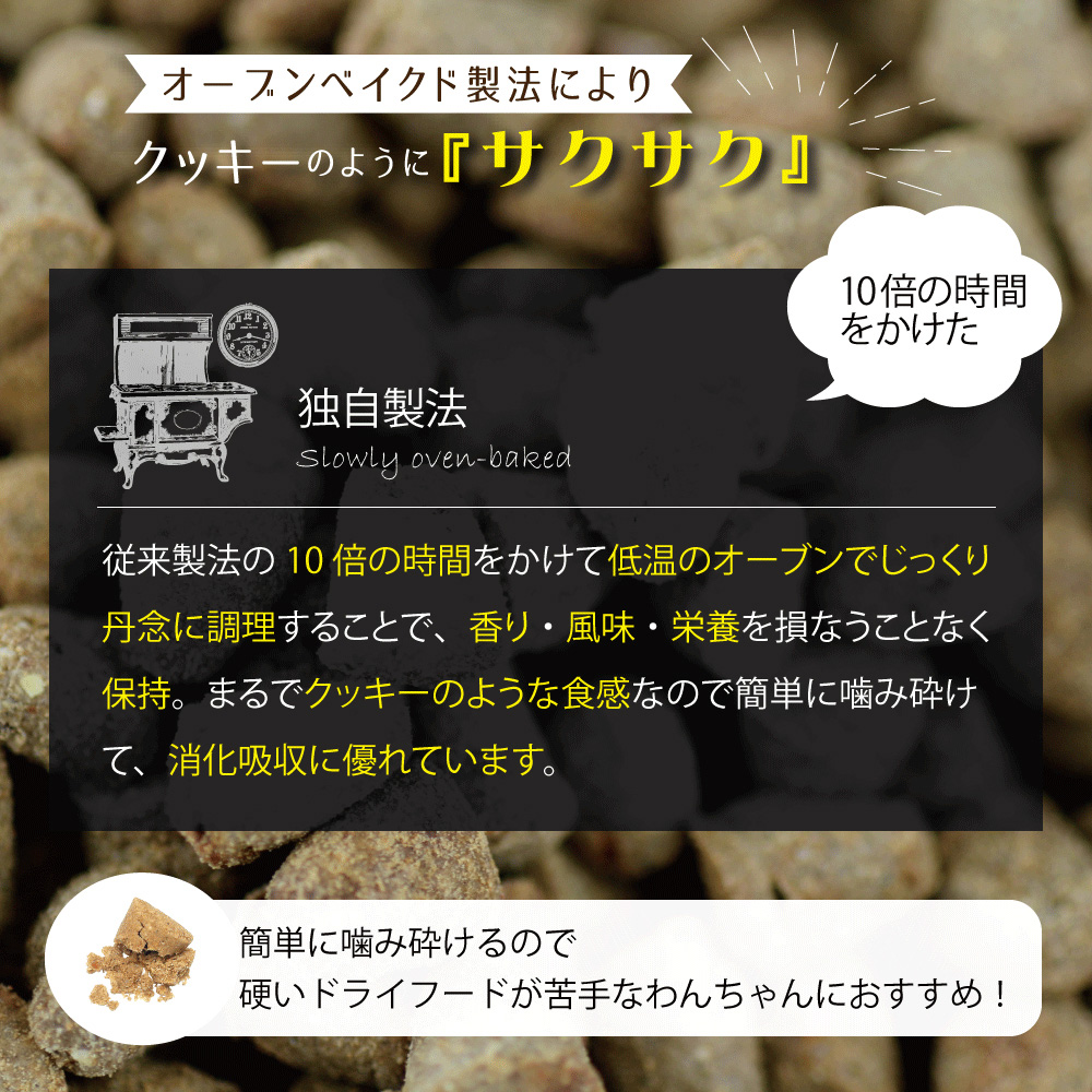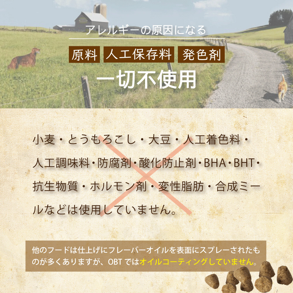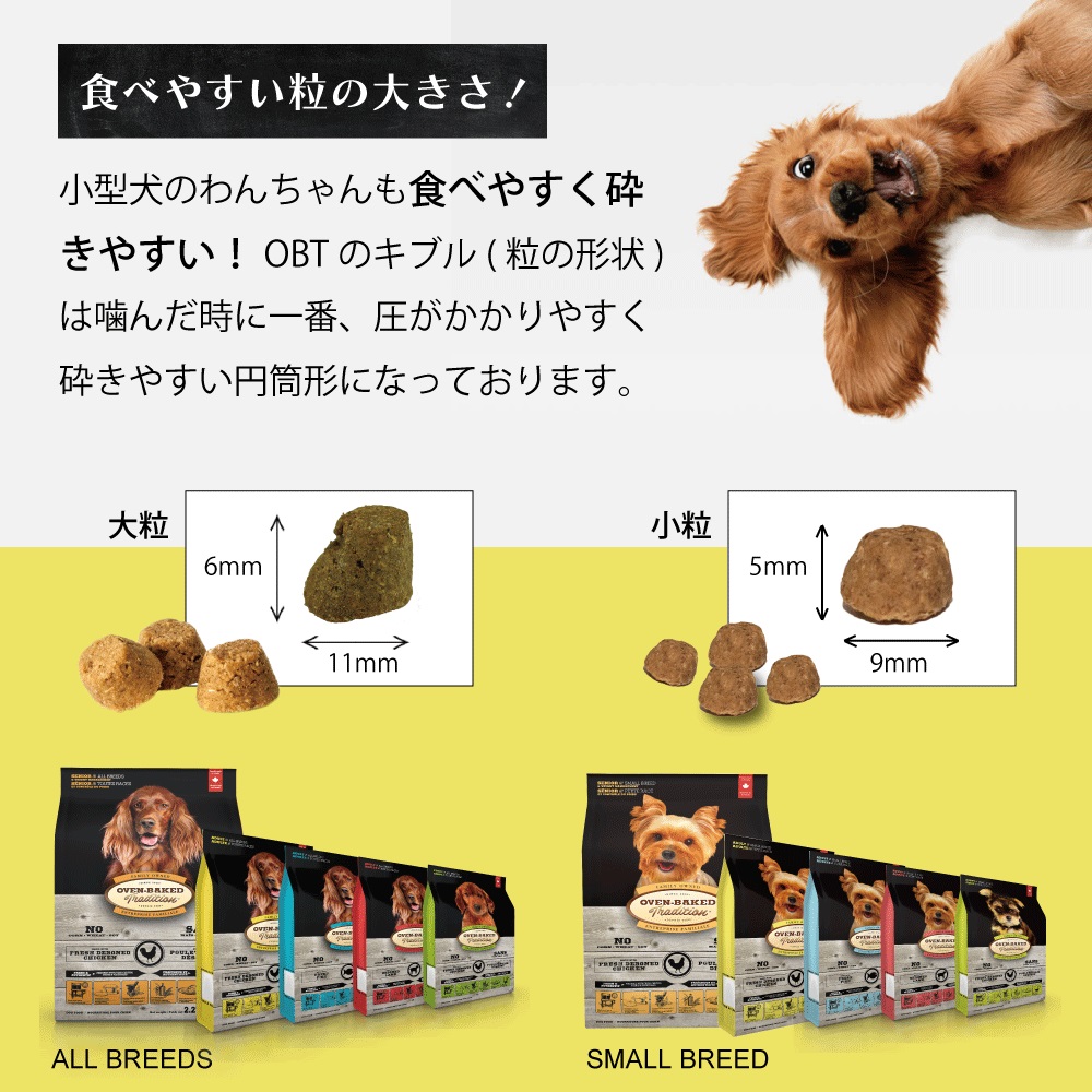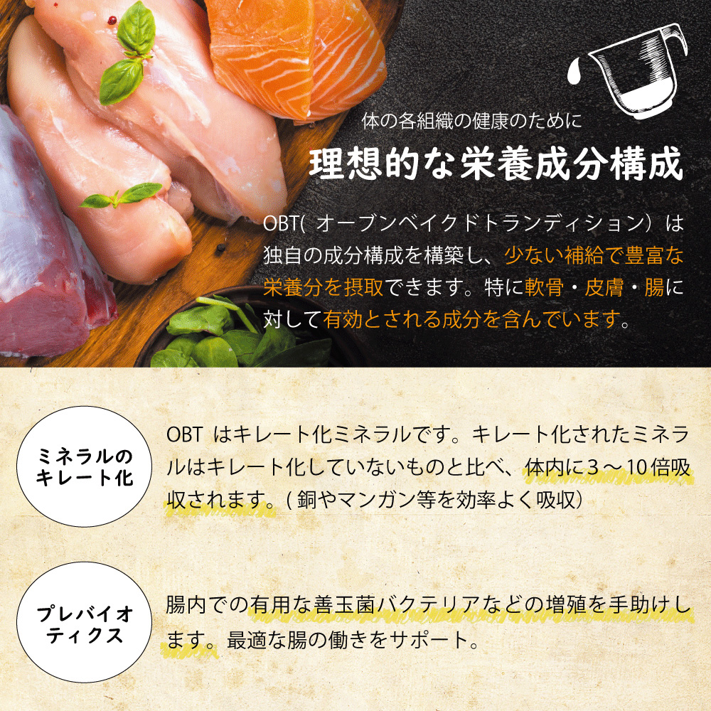 オーブンベークドトラディション(※以下 OBT)は従来のドライフードの製造にかかる時間の、実に10倍の時間をかけて丹念に調理されています。一般によくあるドライフードは製造コストを抑えるために高温で加工することが多く、その結果、栄養分は破壊されてしまいます。OBTは低温でじっくりと時間をかけることで、香り・風味・栄養分を損なうことなく保持することが可能となりました。「オーブンベークド製法」は粒がカチカチに硬くなることがなく、 簡単に噛み砕けて、消化吸収に優れています。
