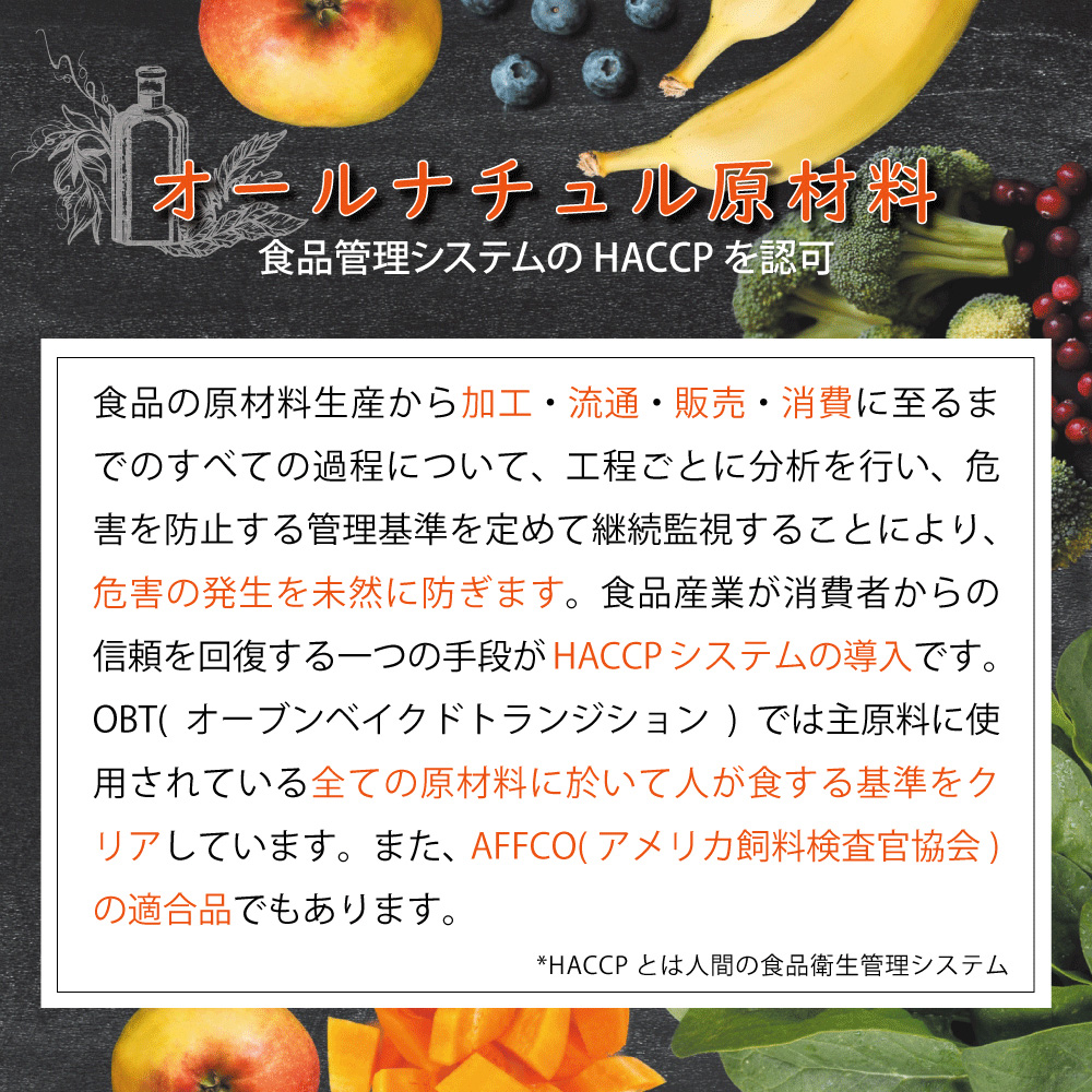 OBTを製造しているバイオビスケット社はHACCP(ハサップ)の認可を受けております。HACCPとは人間の食品衛生管理システムです。OBTでは主原料に使用されている全ての原材料に於いて人が食する基準をクリアしています。もちろん、AFFCO(アメリカ飼料検査官協会)の適合品でもあります。