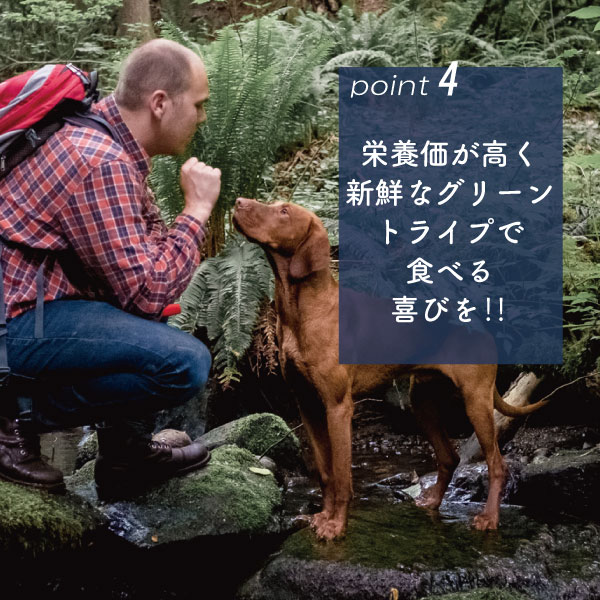 トライプファースト&グレインフリーの総合栄養食。愛犬の健康のためにトライプを第一主原料に使用。さらに、ナチュラルフード、ヒューマングレード、グレインフリーにこだわり肉食の愛犬の本来の食事に配慮しました。