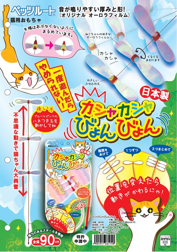びょんびょん、一度遊んだらやめられない!カシャカシャ音と不思議な動きに拘った日本製!(3つの)羽根付き玉の位置を動かして、トリッキーな羽音と動きをお試しください。猫ちゃんの狩猟本能を必ず満足させます。