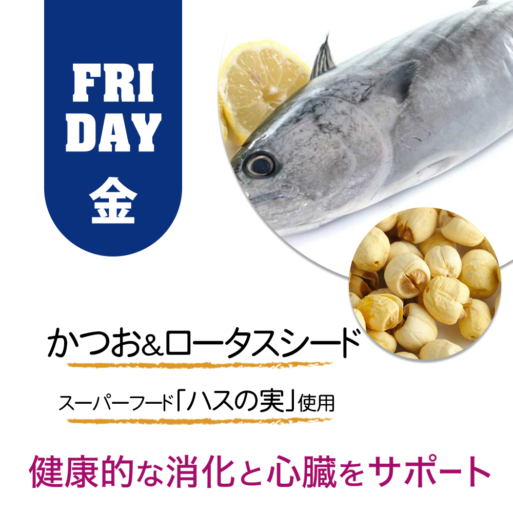 | 原材料 | チキン、かつお、ハスの実、ビタミンとミネラル(第三リン酸カルシウム、塩化カリウム、塩化ナトリウム、塩化コリン、硫酸マグネシウム、硫酸第一鉄、酸化亜鉛、α-トコフェロール、ニコチン酸、酢酸レチノール、たんぱく質キレート銅、硫酸マンガン、チアミン硝酸塩、第二リン酸カルシウム、パントテン酸カルシウム、リボフラビン、ピリドキシン塩酸塩、ビオチン、ビタミンB12、亜セレン酸ナトリウム、コレカルシフェロール、葉酸、ヨウ化カリウム、酸化マグネシウム)、チキンレバー、グリシン、グアーガム、カラメル、まぐろエキス、タウリン |