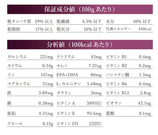 保障成分値(100gあたり) 粗タンパク質29%以上、粗脂肪17%以上、粗繊維4.5%以下、粗灰分10%以下、水分10%以下