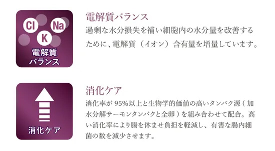 『電解質バランス』過剰な水分損失を補い細胞内の水分量を改善するために、電解質(イオン)含有量を増量しています。