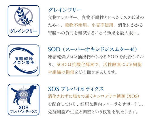 『グレインフリー』食物アレルギー、食物不耐性といったリスク低減のために穀物不使用、小麦不使用。