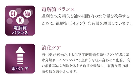 『電解質バランス』過剰な水分損失を補い細胞内の水分量を改善するために、電解質(イオン)含有量を増量しています。
