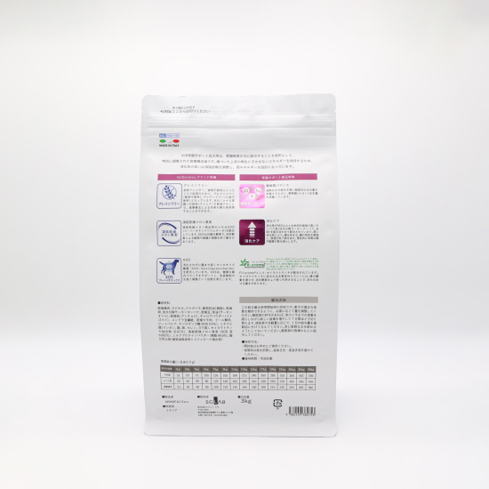 乾燥鶏肉※※、タピオカ、ジャガイモ、動物性油脂(鶏脂)※、乾燥卵※※、加水分解サーモンタンパク、乾燥豆、魚油(サーモンオイル)※、乾燥魚(アンチョビ)、キャロブパウダー(イナゴマメ)、エンドウ豆繊維、乾燥カモ肉、ビール酵母、ビートパルプ、キシロオリゴ糖(XOS0.4%)、ミネラル類(マンガン、銅、鉄、セレン、ヨウ素)、セイヨウトチノキ抽出物(0.01%)、凍結乾燥メロン果実(SOD源0.005%)、ミルクプロテインパウダー、酸化防止剤(植物油脂由来トコフェロール抽出物)※精製 99.6%一天然酸化防止剤で保存※※高消化性