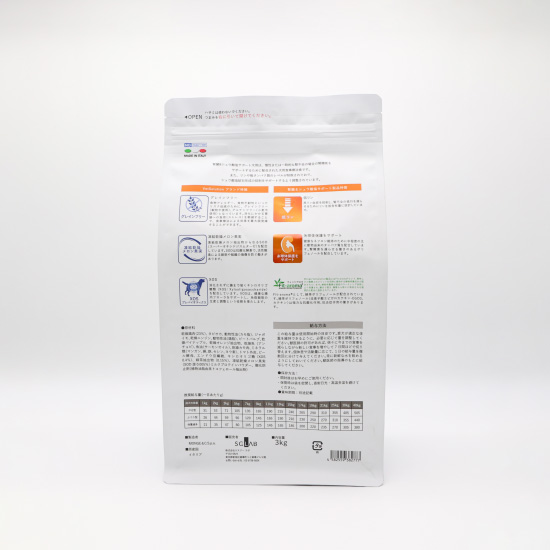 乾燥鶏肉(23%)※※、タピオカ、動物性油脂(カモ脂)※、ジャガイモ、乾燥ニンジン、動物性油脂(鶏脂)※、ビートパルプ、乾燥パイナップル、乾燥オレンジ抽出物、乾燥魚(アンチョビ)※※、魚油(サーモンオイル)※、乾燥カモ肉**、ミネラル類(マンガン、銅、鉄、セレン、ヨウ素)、トマト外皮、ビール酵母、エンドウ豆繊維、キシロオリゴ糖(XOS 0.4%)、緑茶抽出物(0.15%)、凍結乾燥メロン果実(SOD源0.005%)ミルクプロテインパウダー、酸化防止 剤(植物油脂由来トコフェロール抽出物)※精製 99.6%一天然酸化防止剤で保存※※タンパク源(消化率85%以上)