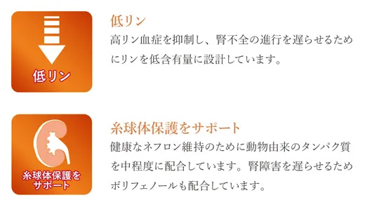 『糸球体保護をサポート』健康なネフロン維持のために動物由来のタンパク質を中程度に配合しています。