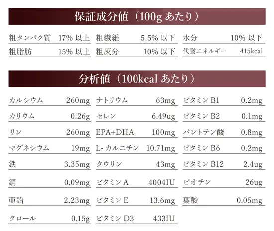 保障成分値(100gあたり) 粗タンパク質17%以上、粗脂肪15%以上、粗繊維5.5%以下、粗灰分10%以下、水分10%以下