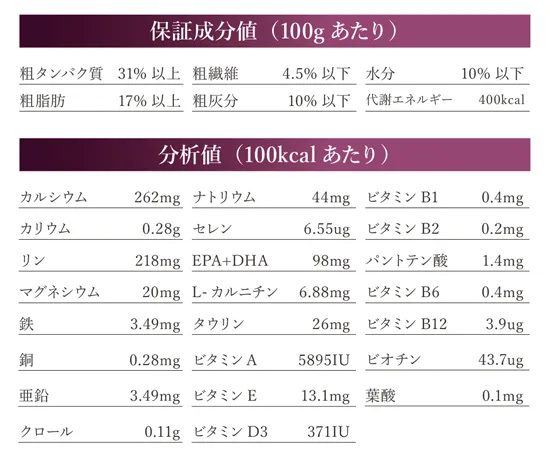 保障成分値(100gあたり) 粗タンパク質31%以上、粗脂肪17%以上、粗繊維4.5%以下、粗灰分10%以下、水分10%以下