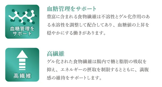 『血糖管理をサポート』豊富に含まれる食物繊維は不溶性とゲル化作用のある水溶性を調整して配合。