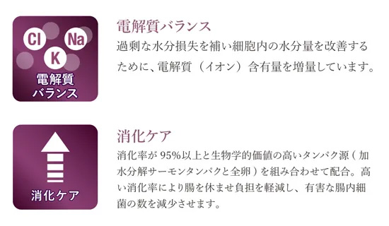 『消化ケア』消化率が95%以上と生物学的価値の高いタンパク源(加水分解サーモンタンパクと全卵)を組み合わせて配合。