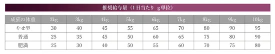 保障成分値(100gあたり) 粗タンパク質30%以上、粗脂肪17%以上、粗繊維7%以下、粗灰分10%以下、水分8%以下