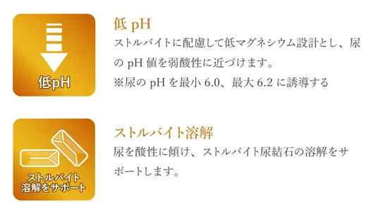 『低pH』ストバイトに配慮して低マグネシウム設計とし、尿のpH値を弱酸性に近づけます。※尿のpHを最小6.0、最大 6.2に誘導する
