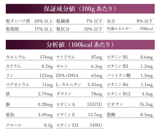 保障成分値(100gあたり) 粗タンパク質30%以上、粗脂肪17%以上、粗繊維7%以下、粗灰分10%以下、水分8%以下
