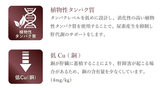 消化性に優れた植物性タンパク質を豊富に含み、銅含有量を制限しています。また、高カロリー設計で食欲不振でも十分な栄養補給が可能となるように配慮しています。