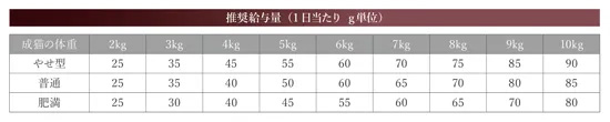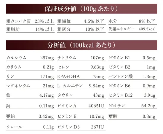 保障成分値(100gあたり) 粗タンパク質23%以上、粗脂肪14%以上、粗繊維4.5%以下、粗灰分10%以下、水分8%以下