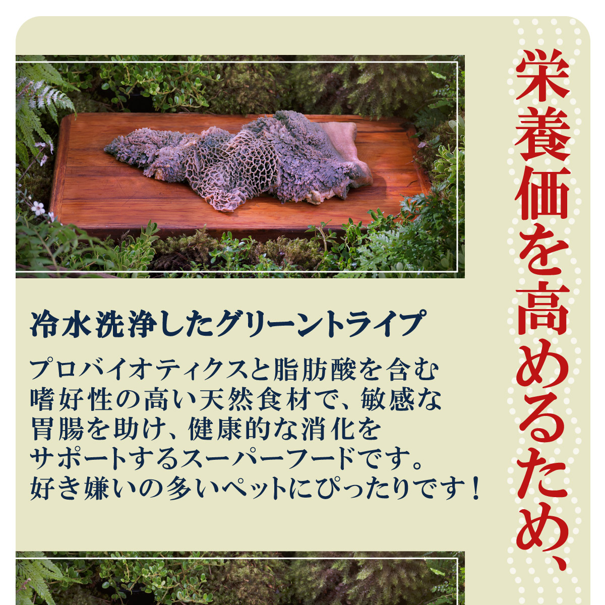 | 原材料 | ラムトライプ生肉、ラム生肉、ラムラング生肉、ラムレバー生肉、ラムハート生肉、ラムキドニー生肉、ニュージーランド緑イ貝、ラムボーンレシチンミネラル類(リン酸二カリウム、硫酸マグネシウム、亜鉛アミノ酸複合体、銅アミノ酸複合体、セレン酵母、マンガンアミノ酸複合体)乾燥海草、海塩ビタミン類(E、チアミン硝酸塩、B5、D3、葉酸)増粘安定剤としてひよこ豆を使用 |