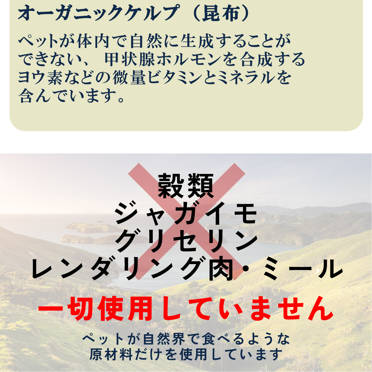 | 穀類、ジャガイモ、グリセリン、レンダリング肉やミールは一切使用していません。 | |