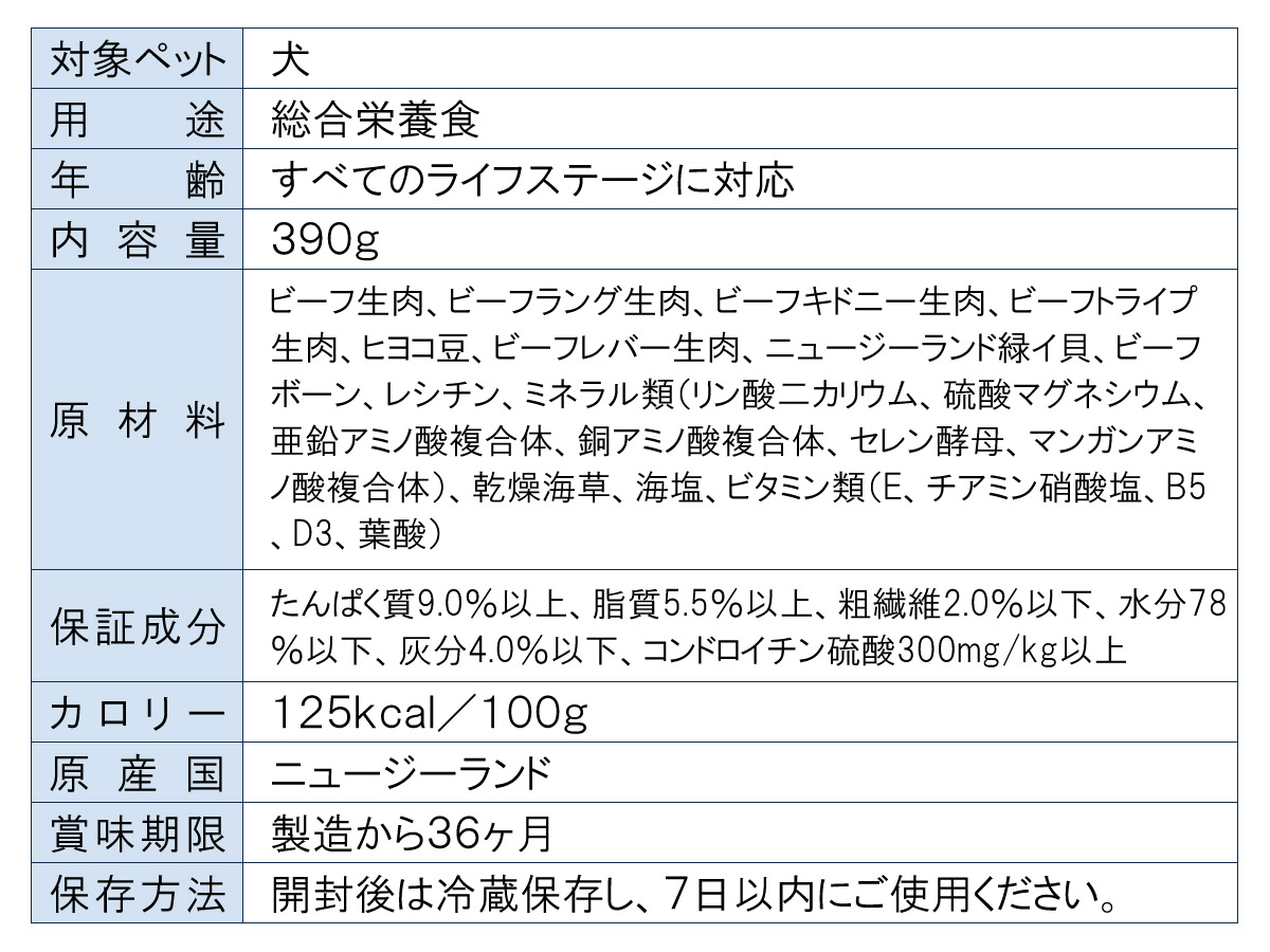 | 原材料 | ビーフ生肉、ビーフラング生肉、ビーフキドニー生肉、ビーフトライプ生肉、ビーフレバー生肉、ニュージーランド緑イ貝、ビーフボーン、レシチン、ミネラル類(リン酸二カリウム、硫酸マグネシウム、亜鉛アミノ酸複合体、銅アミノ酸複合体、セレン酵母、マンガンアミノ酸複合体)、乾燥海草、海塩、ビタミン類(E、チアミン硝酸塩、B5、D3、葉酸)/増粘安定剤としてひよこ豆を使用 |