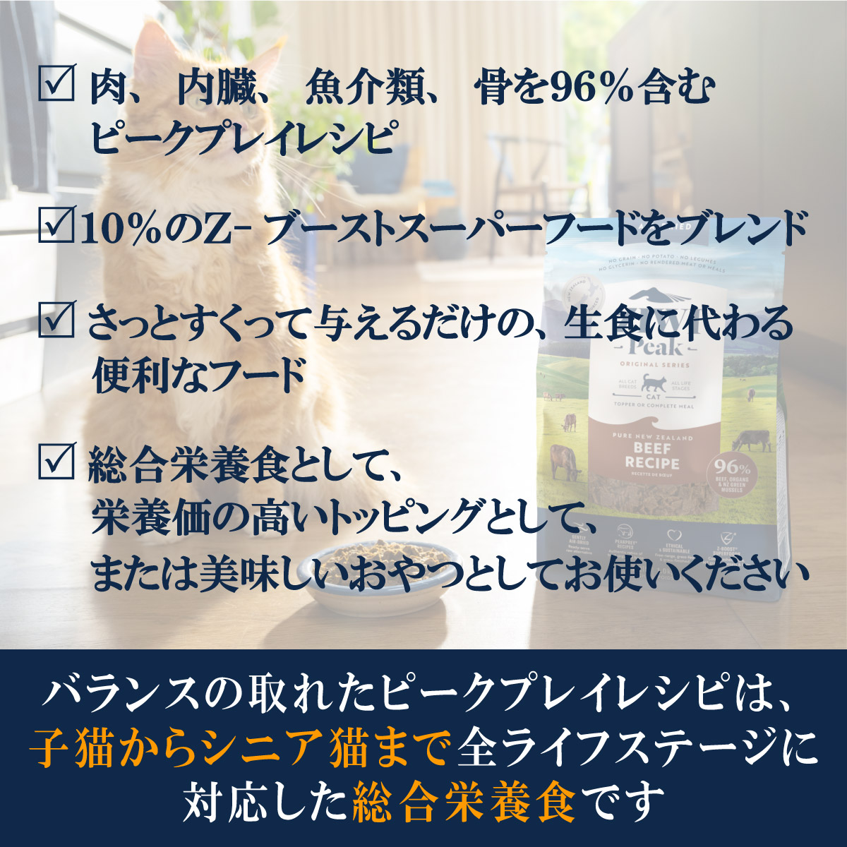 | 肉、内臓、魚介類、骨を96%含むピークプレイレシピ。 | |
