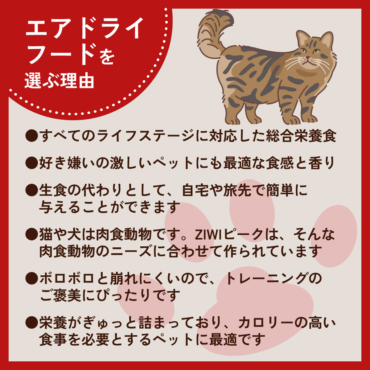 | ZIWIは、高品質かつ最高の栄養をお届けすることに全力を注いでいます。自然本来の食事を再現したピークプレイレシピや、ペットの食事にさらなる栄養をプラスするZ-ブーストスーパーフード、そして独自のZ-ツインテックエアドライ技術によって、ペットの幸せで健康な毎日をサポートします。 | |