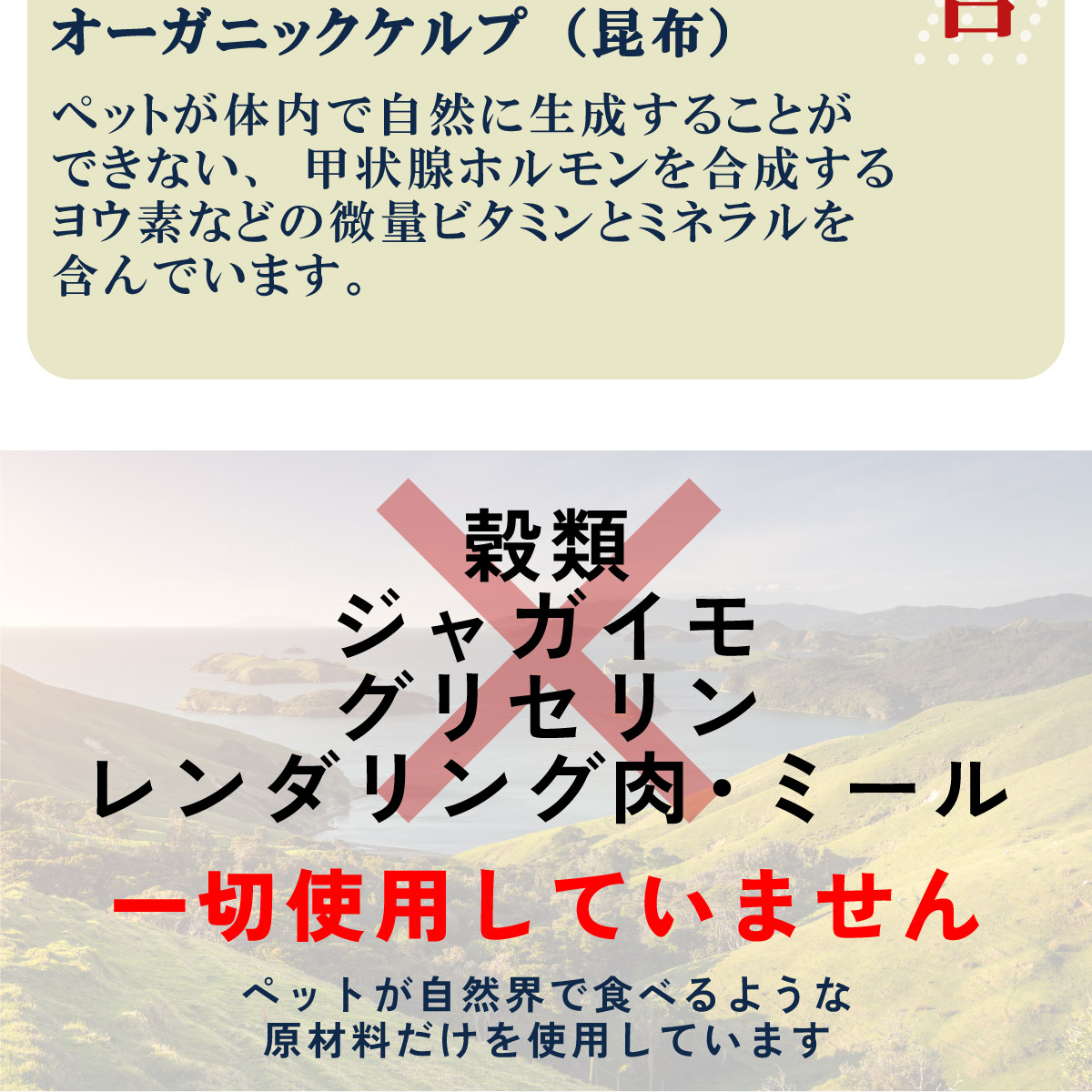 | 穀類、ジャガイモ、グリセリン、レンダリング肉やミールは一切使用していません。 | |