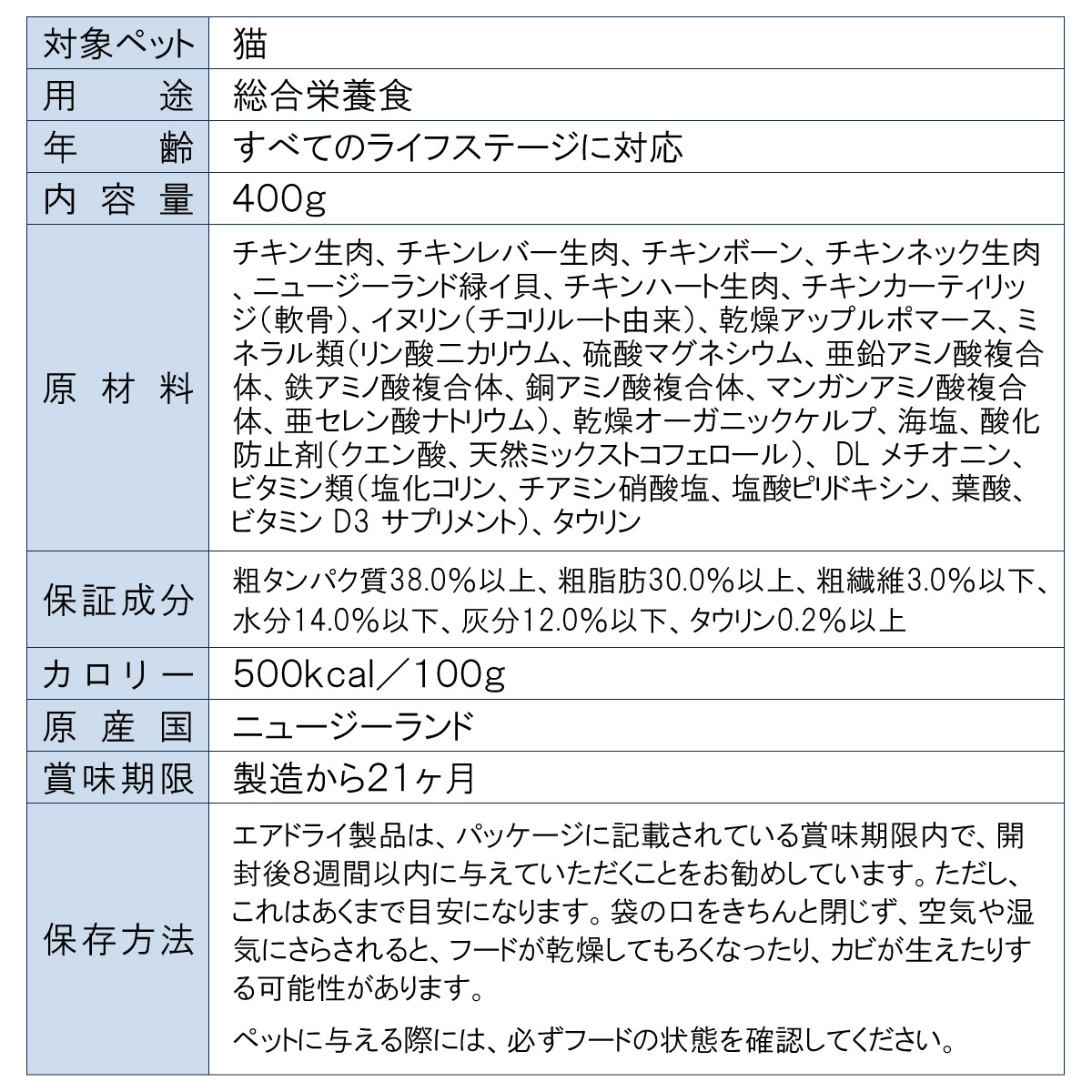 | 原材料 | チキン生肉、チキンレバー生肉、チキンボーン、チキンネック生肉、ニュージーランド緑イ貝、チキンハート生肉、チキンカーティリッジ(軟骨)、イヌリン(チコリルート由来)、乾燥アップルポマース、ミネラル類(リン酸二カリウム、硫酸マグネシウム、亜鉛アミノ酸複合体、鉄アミノ酸複合体、銅アミノ酸複合体、マンガンアミノ酸複合体、亜セレン酸ナトリウム)、乾燥オーガニックケルプ、海塩、酸化防止剤(クエン酸、天然ミックストコフェロール)、 DL メチオニン、ビタミン類(塩化コリン、チアミン硝酸塩、塩酸ピリドキシン、葉酸、ビタミン D3 サプリメント)、タウリン |