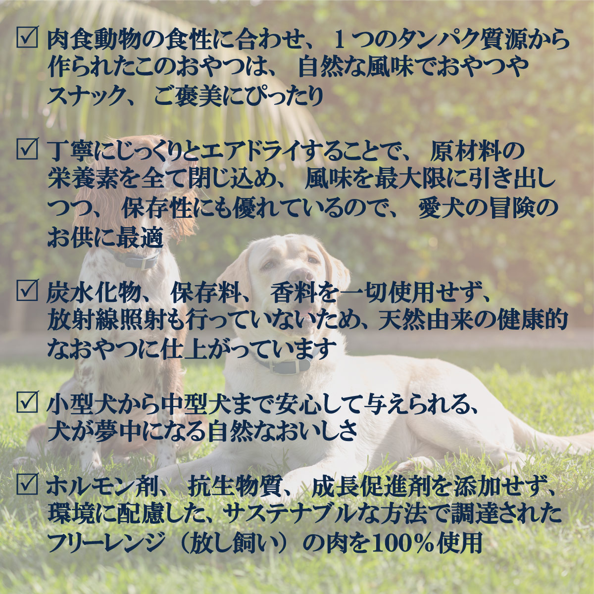| ホルモン剤、抗生物質、成長促進剤を添加せず、環境に配慮した、サステナブルな方法で調達されたフリーレンジ(放し飼い)の肉を100%使用したおやつです。 | |