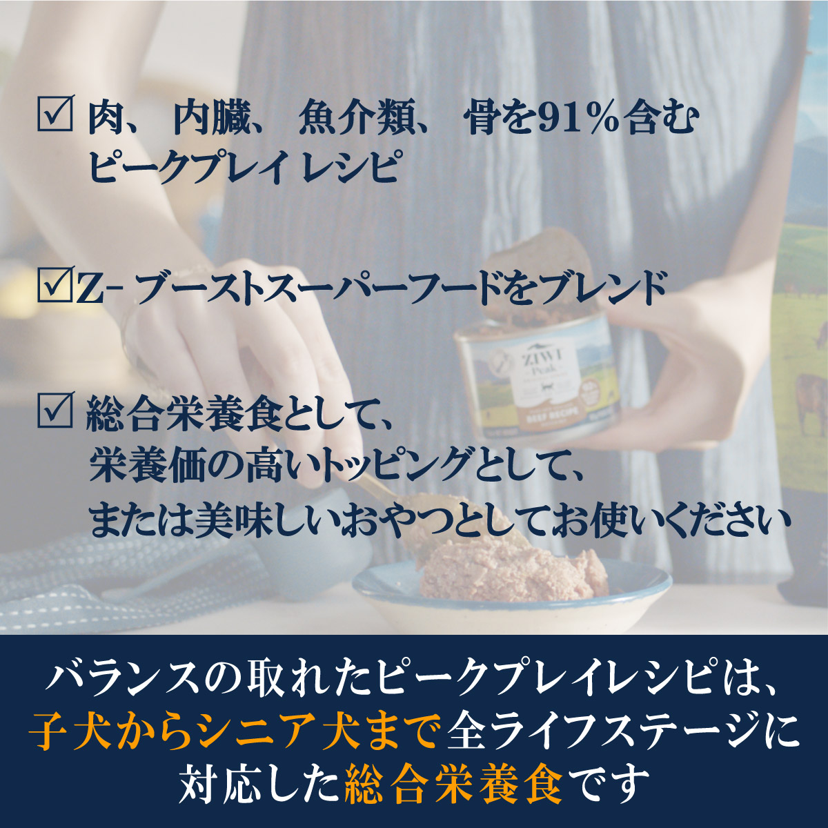 | ZIWIは、高品質かつ最高の栄養をお届けすることに全力を注いでいます。自然本来の食事を再現したピークプレイレシピや、ペットの食事にさらなる栄養をプラスするZ-ブーストスーパーフード、そして独自のZ-ツインテックエアドライ技術によって、ペットの幸せで健康な毎日をサポートします。 | |