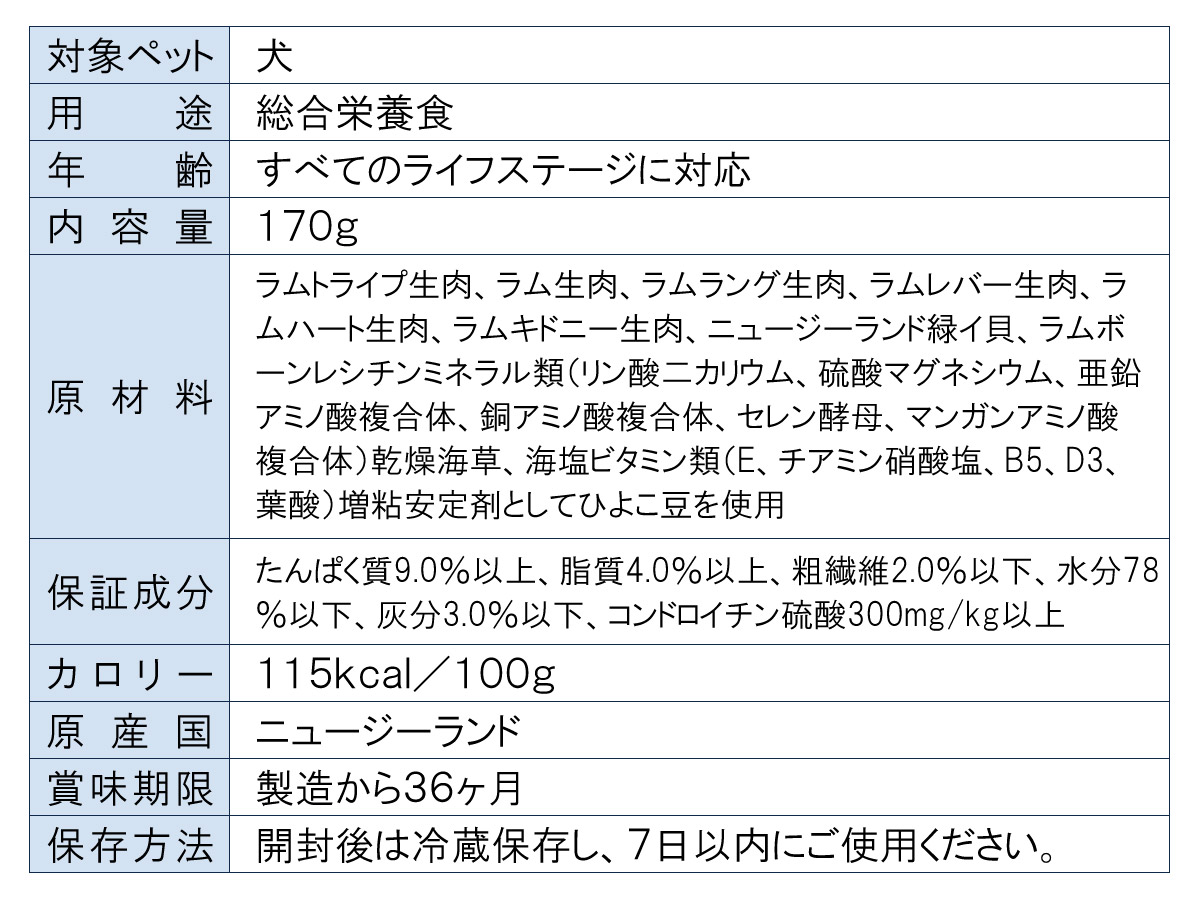 | 原材料 | ラムトライプ生肉、ラム生肉、ラムラング生肉、ラムレバー生肉、ラムハート生肉、ラムキドニー生肉、ニュージーランド緑イ貝、ラムボーン、レシチン、ミネラル類(リン酸二カリウム、硫酸マグネシウム、亜鉛アミノ酸複合体、銅アミノ酸複合体、セレン酵母、マンガンアミノ酸複合体)、乾燥海草、海塩、ビタミン類(E、チアミン硝酸塩、B5、D3、葉酸)/増粘安定剤としてひよこ豆を使用 |