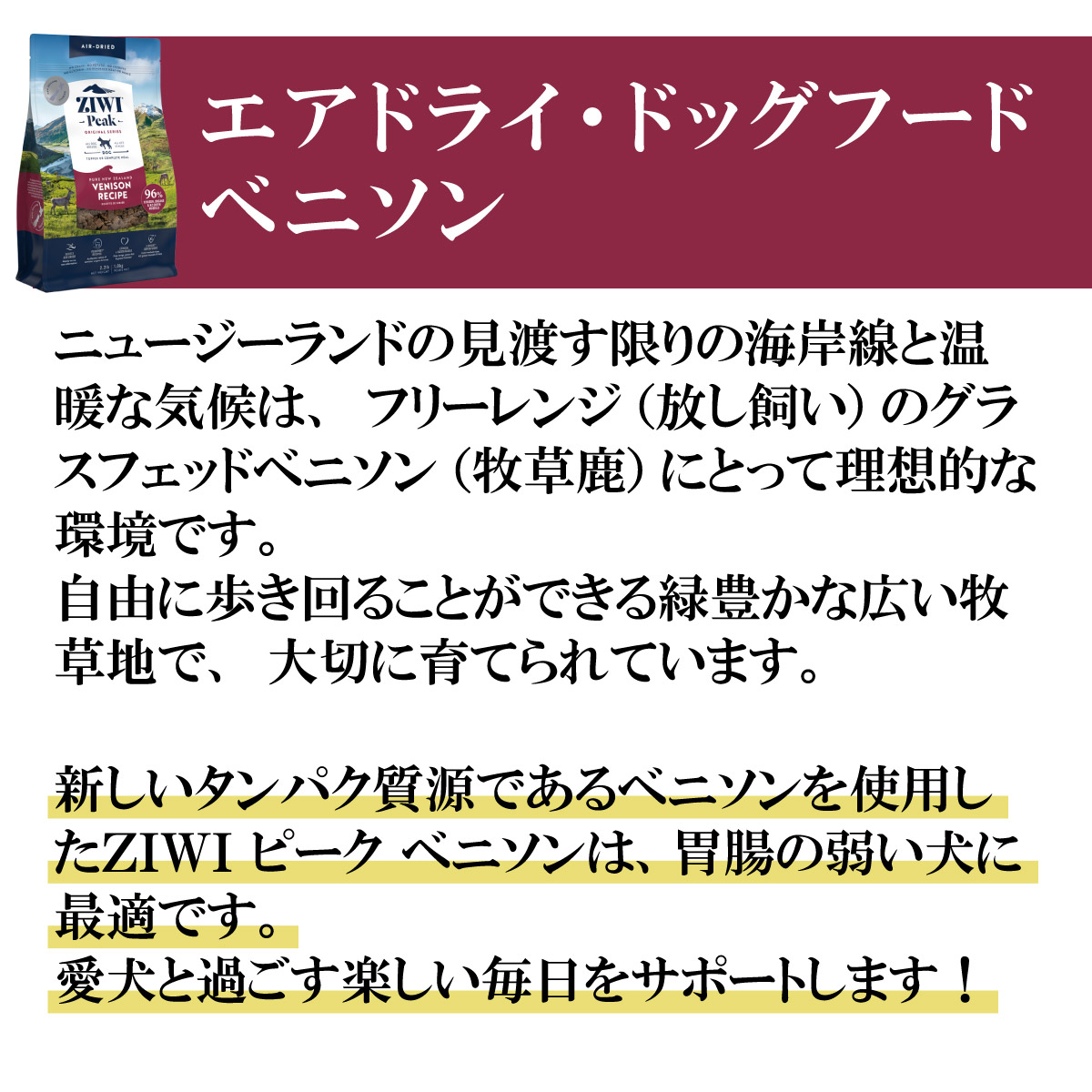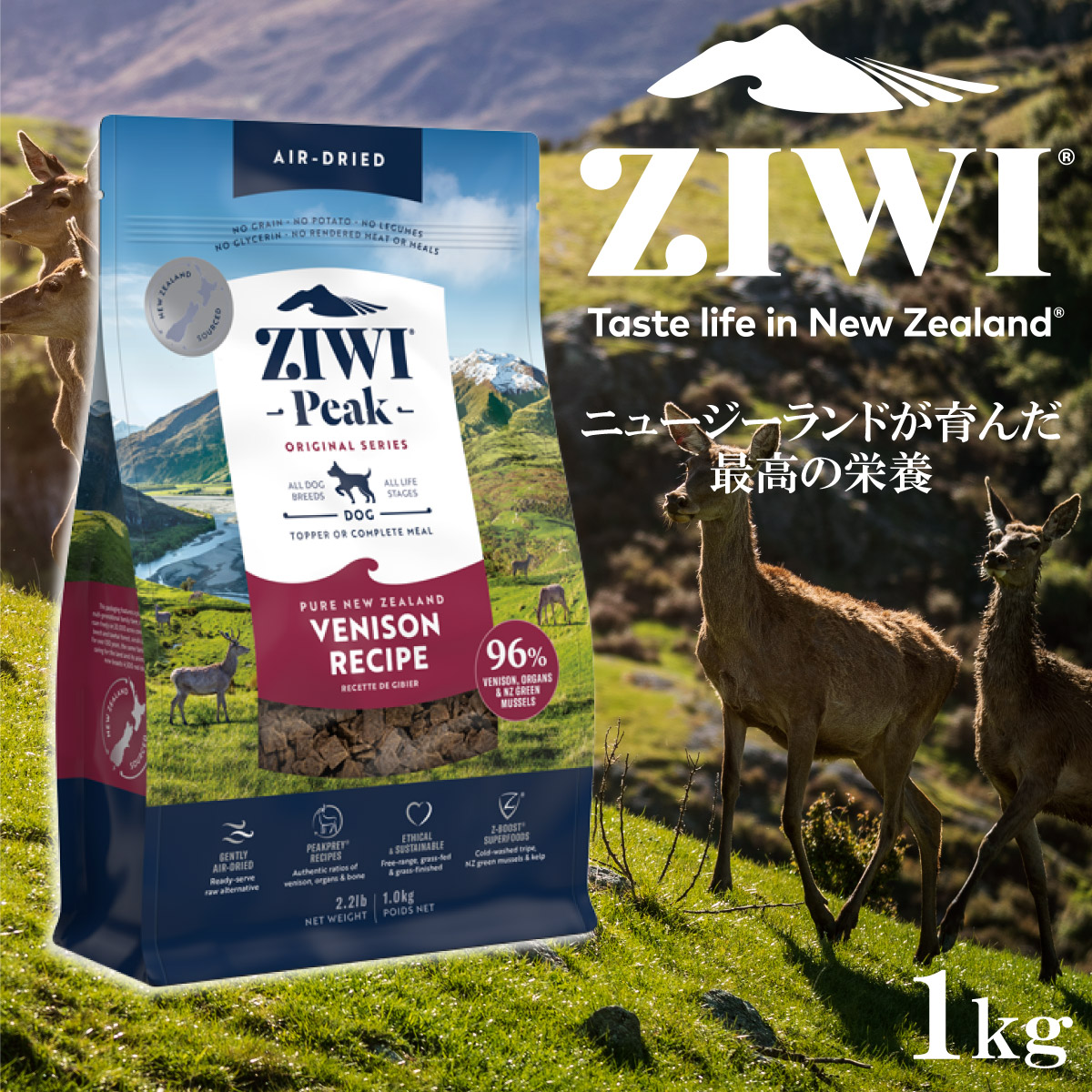 | ニュージーランドの見渡す限りの海岸線と温暖な気候は、フリーレンジ(放し飼い)のグラスフェッドベニソン(牧草鹿)にとって理想的な環境です。自由に歩き回ることができる緑豊かな広い牧草地で、大切に育てられています。新しいタンパク質源であるベニソンを使用したZIWIピークベニソンは、胃腸の弱い犬に最適です。愛犬と過ごす楽しい毎日をサポートします!バランスの取れたピークプレイレシピは、子犬からシニア犬まで全ライフステージに対応した総合栄養食です。 | |