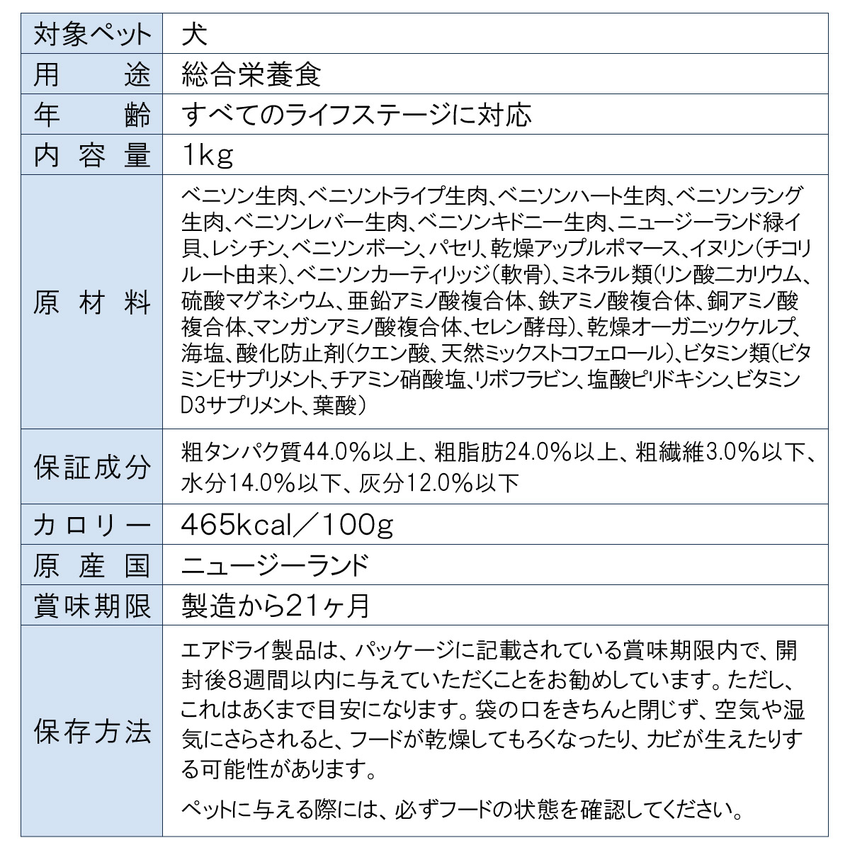 | 原材料 | ベニソン生肉、ベニソントライプ生肉、ベニソンハート生肉、ベニソンラング生肉、ベニソンレバー生肉、ベニソンキドニー生肉、ニュージーランド緑イ貝、レシチン、ベニソンボーン、パセリ、乾燥アップルポマース、イヌリン(チコリルート由来)、ベニソンカーティリッジ(軟骨)、ミネラル類(リン酸二カリウム、硫酸マグネシウム、亜鉛アミノ酸複合体、鉄アミノ酸複合体、銅アミノ酸複合体、マンガンアミノ酸複合体、セレン酵母)、乾燥オーガニックケルプ、海塩、酸化防止剤(クエン酸、天然ミックストコフェロール)、ビタミン類(ビタミン E サプリメント、チアミン硝酸塩、リボフラビン、塩酸ピリドキシン、ビタミン D3 サプリメント、葉酸) |