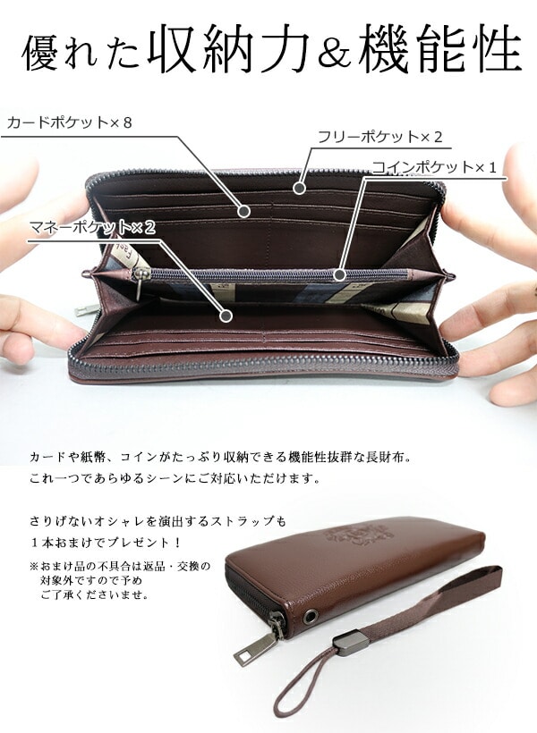 メンズ長財布 ベーシックなかっこいいデザインで、ビジネスにもプライベートでもご使用頂ける逸品となります。 おしゃれなデザイン違いでシーズンごとにお使いいただけます。 取り外し可能な携帯ストラップ(おまけ)を付属しておりますので、ちょっと近くまでの外出でしたら財布だけを持ち出すことも可能。 ラウンドファスナーも使いやすく、出し入れが簡単。