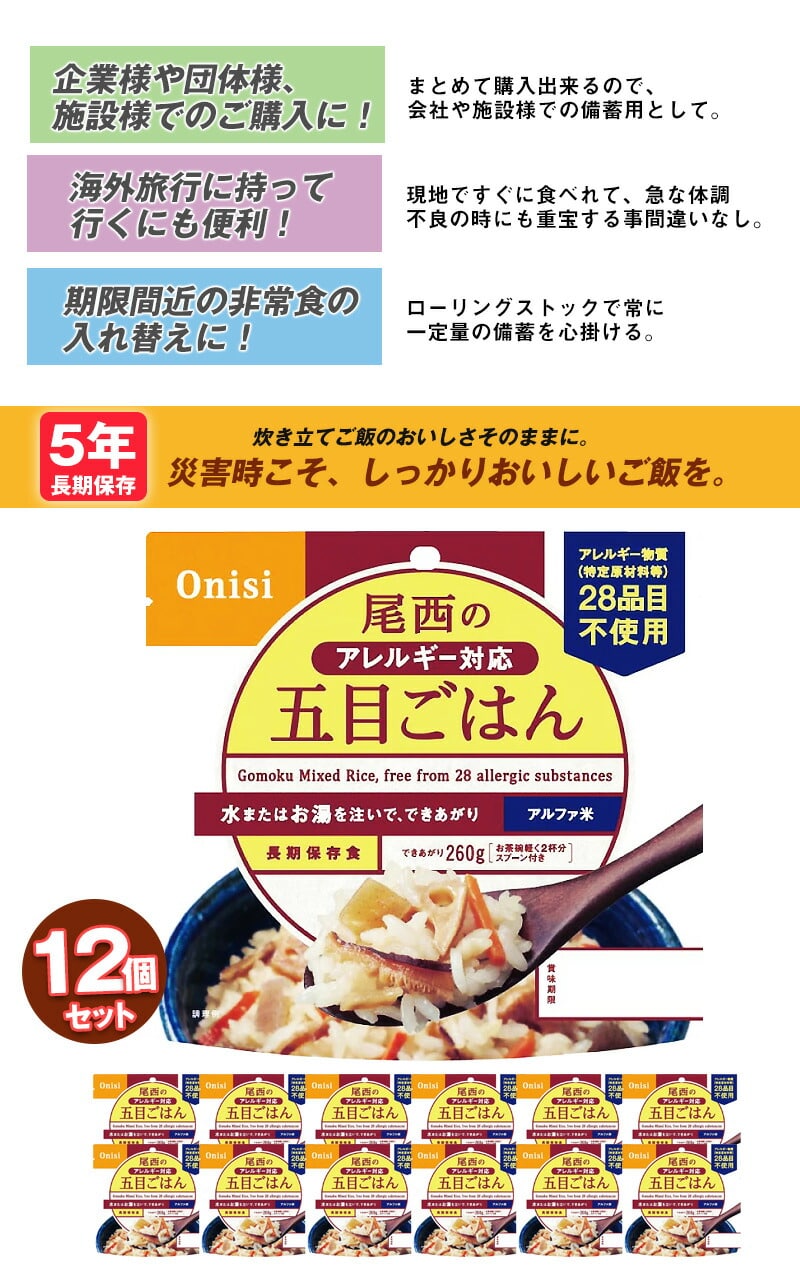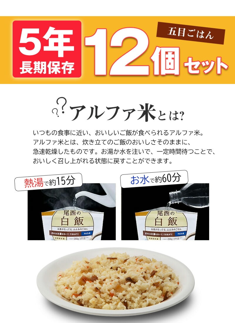お湯でも水でも作ることができる、尾西のアルファ米。 国産米を使用した、おいしくいただけるセットとなっております。