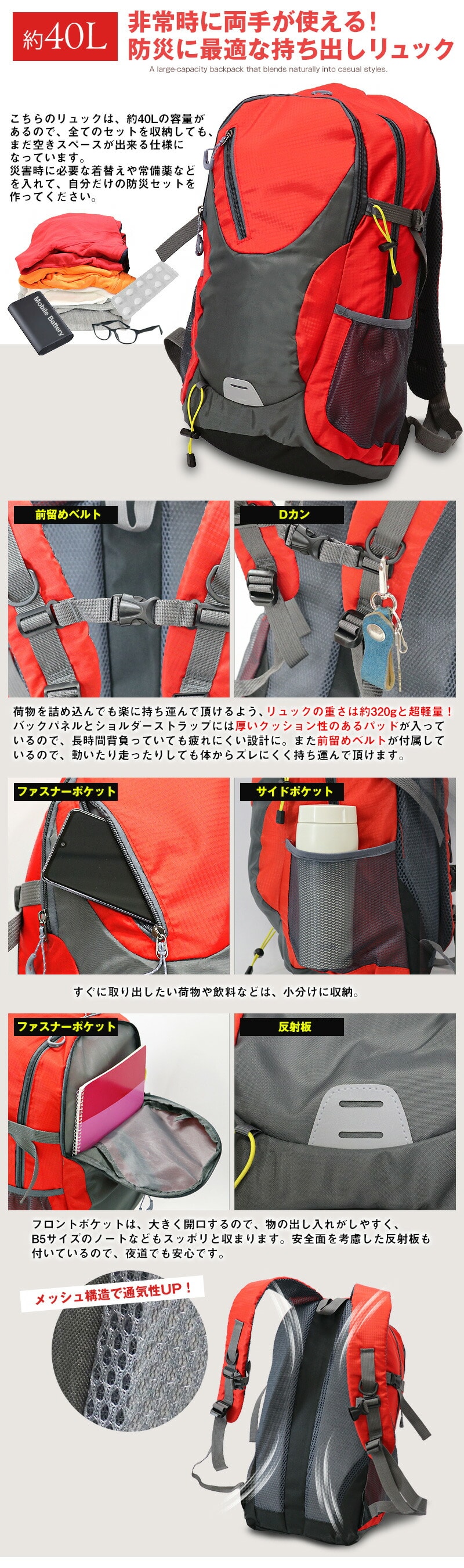 こちらのリュックは約40Lの容量があるので、セットの防災アイテムを入れても、空きスペースがございます。