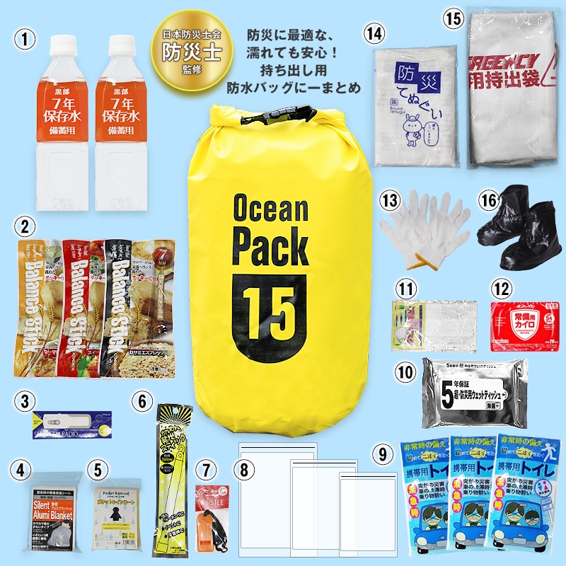 超軽量で機能的!15Lの大容量 防水バッグに日本防災士会 防災士が監修し厳選された防災アイテムをふんだんに詰め込んだ防災セットが登場。