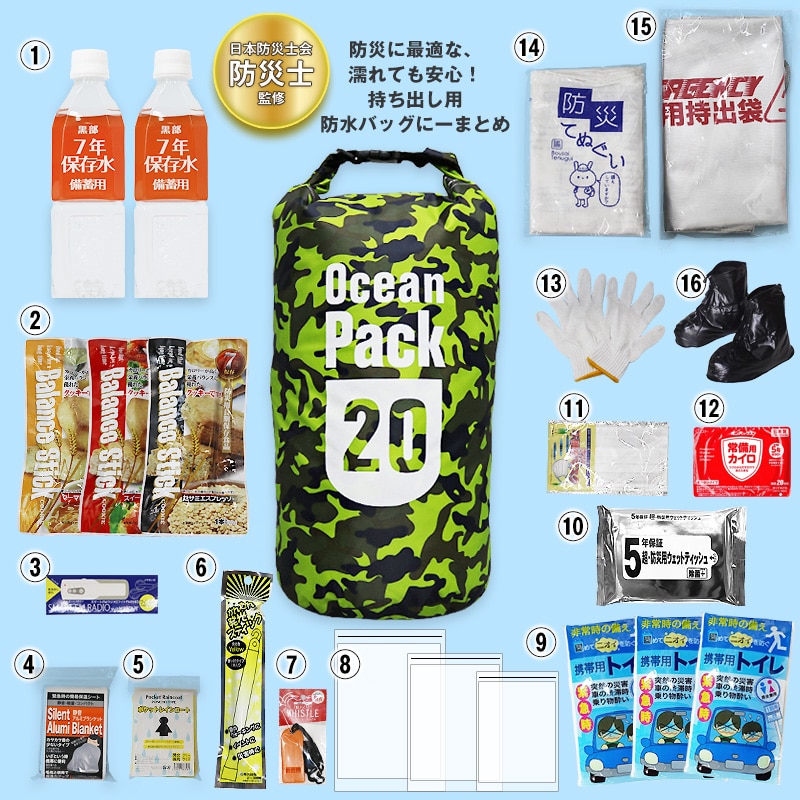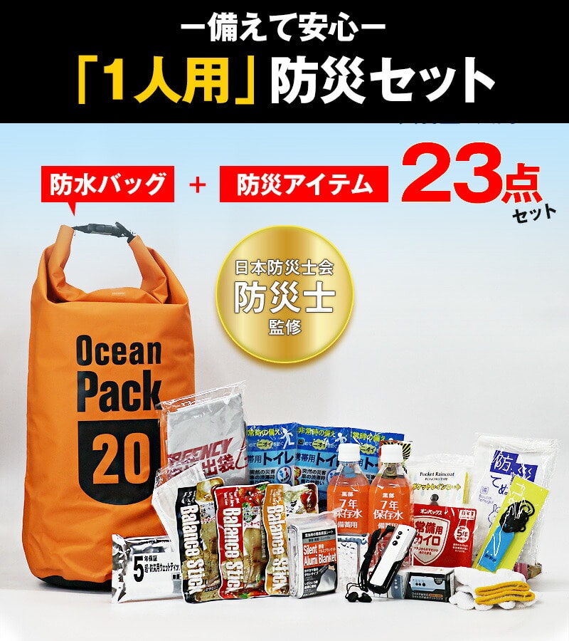 超軽量で機能的!20Lの大容量 防水バッグに日本防災士会 防災士が監修し厳選された防災アイテムをふんだんに詰め込んだ防災セットが登場。