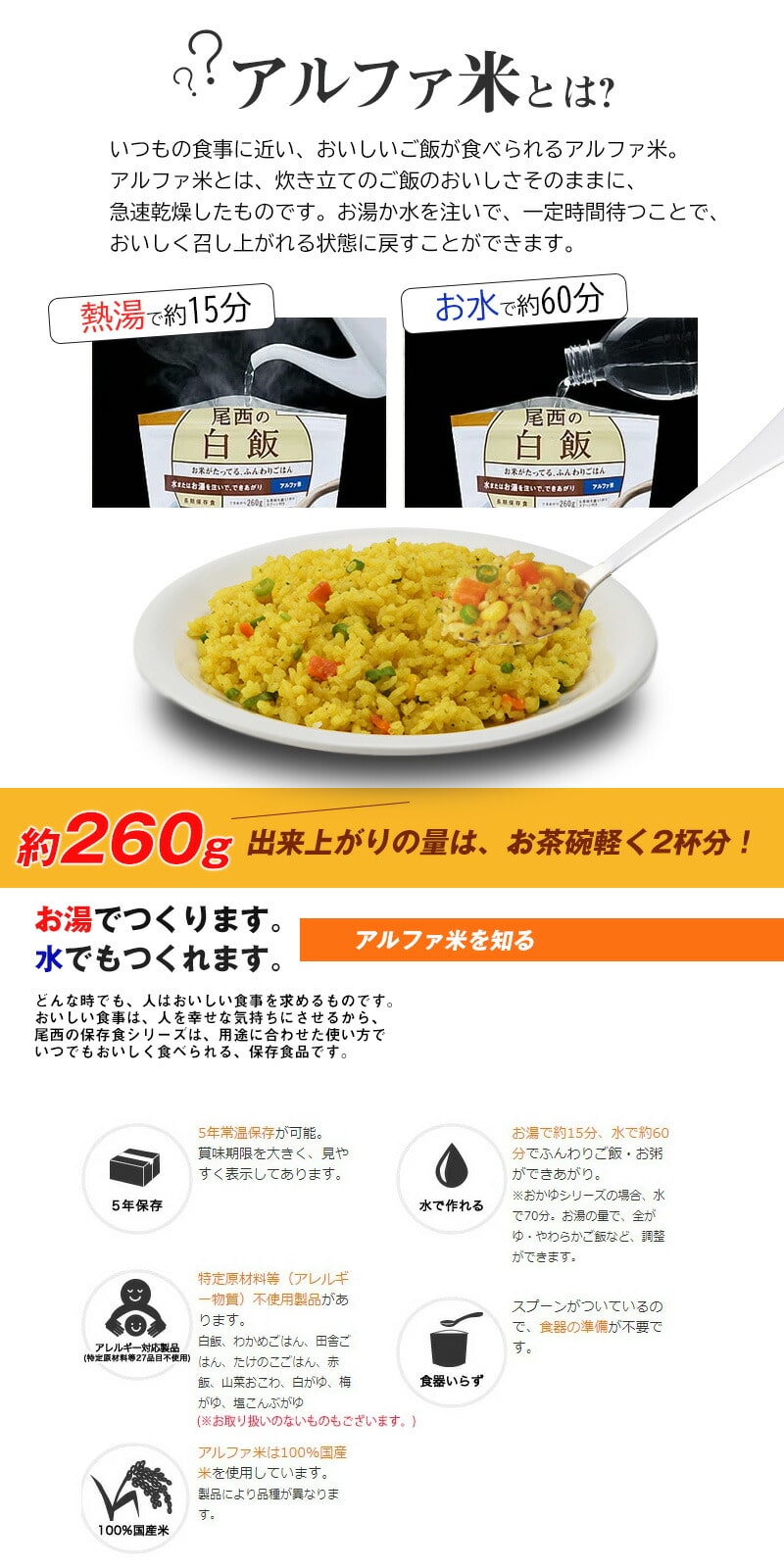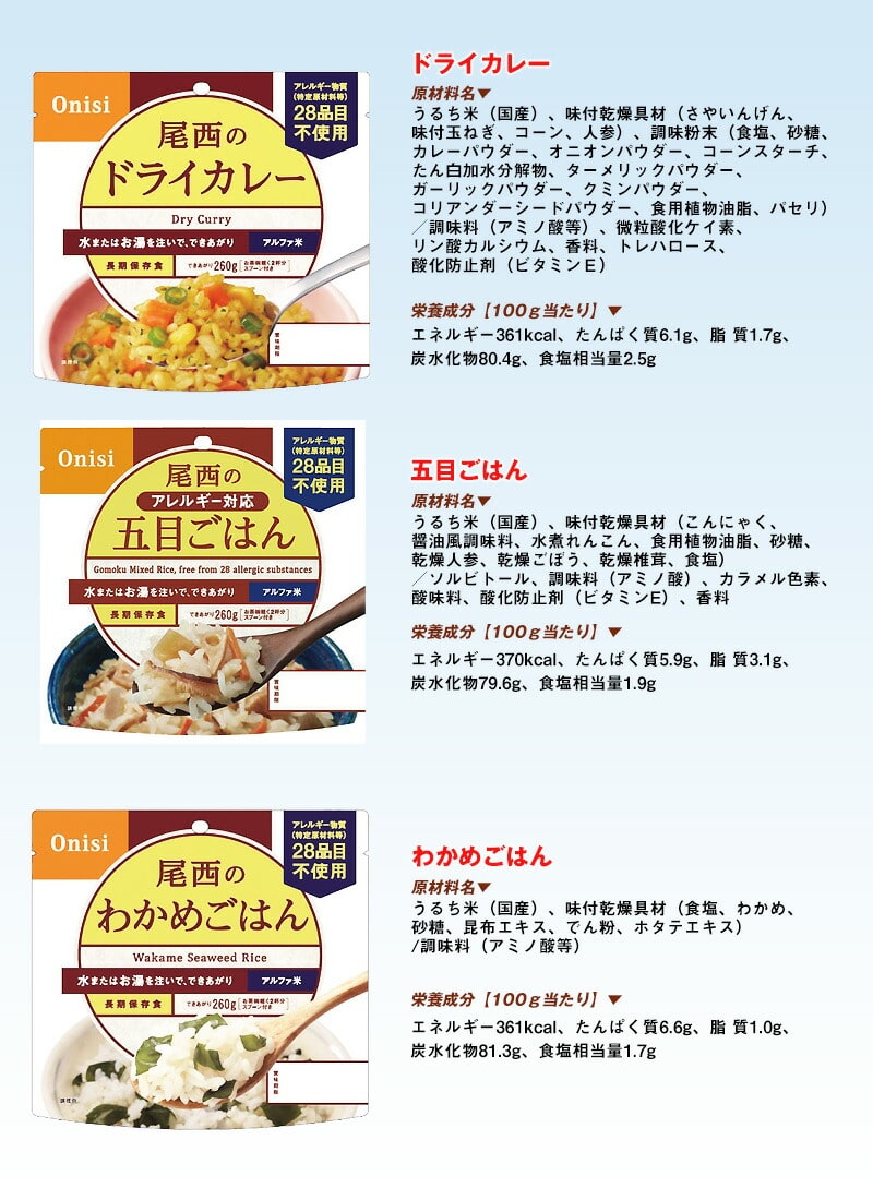 急速乾燥したアルファ米6種類。お湯か水を注いで、一定時間待つことで、