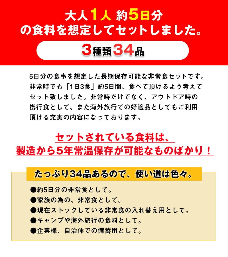 大人1人 約5日分の食事を想定した、長期保存可能な計34品の非常食セットです。