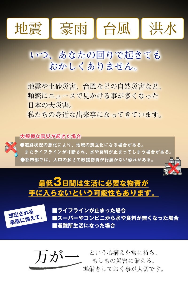 非常時だけでなく、アウトドア時の携行食として、また海外旅行での好適品としてもご利用頂ける充実の内容になっております。