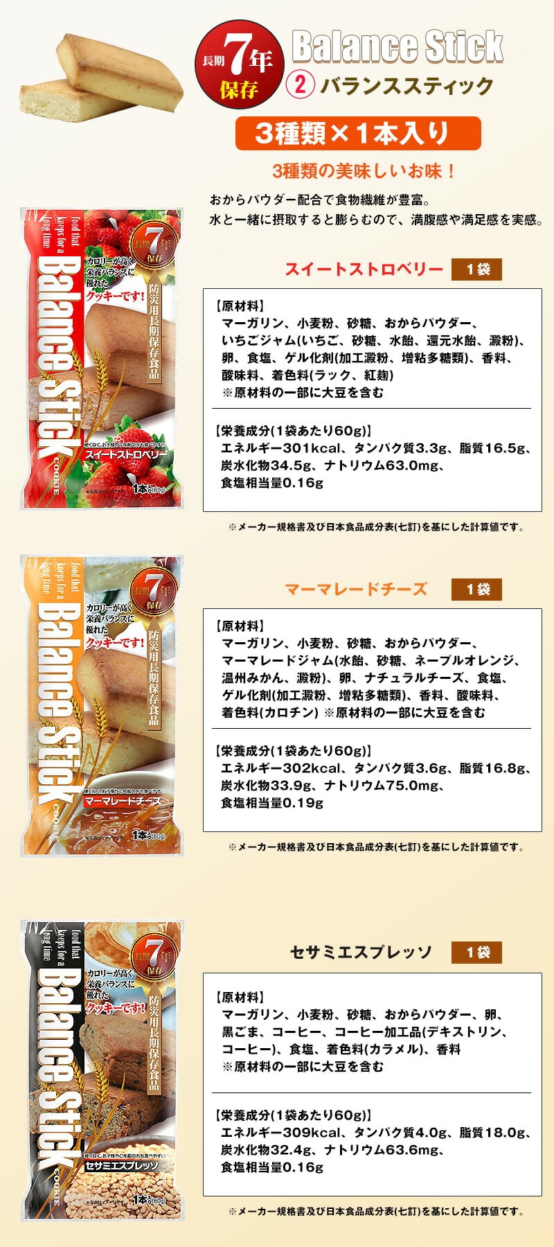 2.バランススティック(1本60g)×(3種類各1本)計3本 3.アルファ米×(5種類各1個)計5個 4.備蓄おにぎり×1個 5.ひだまりパン×(2種類各1個)計2個 6.一汁ご膳×(2種類各1個)計2個 7.ライト付き FMポケットラジオ(単4電池×2本使用/別売)×1個 8.静音アルミブランケット×1個 9.ポケットレインコート×1個 10.発光スティック×1本 11.フラットホイッスル×1個 12.衣類圧縮袋(S/M/Lサイズ×各1枚(計3枚)) 13.携帯用トイレ×3袋 14.超・防災用ウェットティッシュ×1個 15.マスク×1枚 16.常備用カイロ×1個 17.軍手×1組 18.靴用レインシューズカバー×1組 19.防災てぬぐい×1枚 20.非常用持出袋×1個 21.15L給水タンク×1個 22.10L防水バッグ×1個
