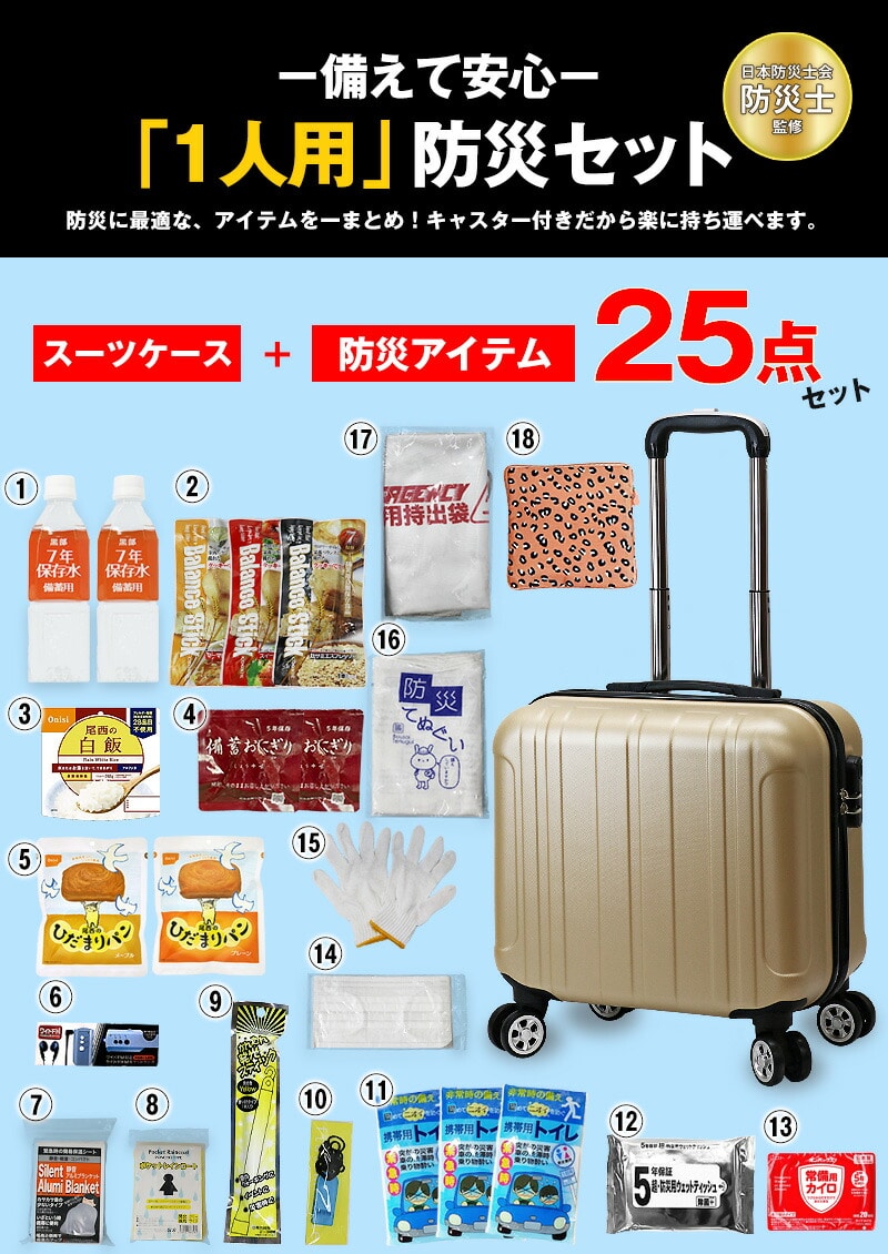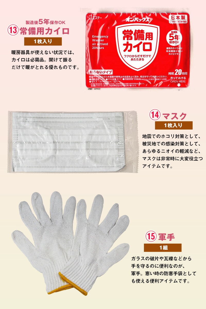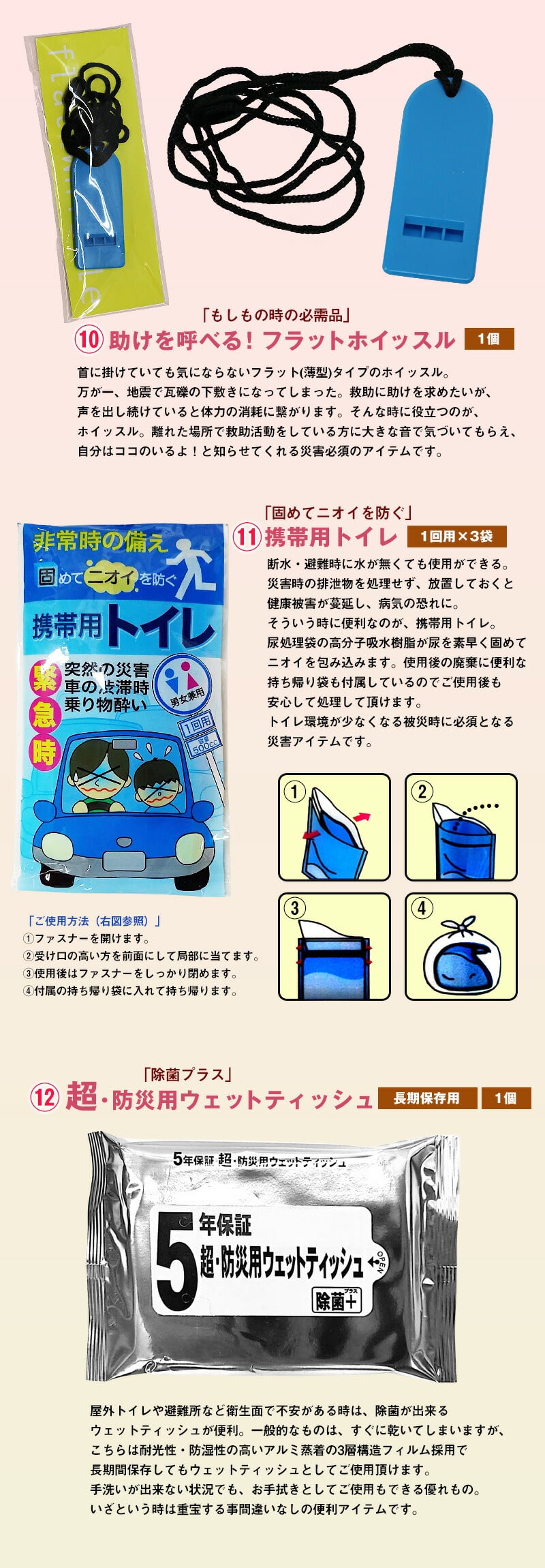 ●日本防災士会 防災士が監修した、非常時に必要になる長期保存が可能な水や食料、使って便利な防災グッズなど、ふんだんに盛り込んだ防災セットをぜひ備えておいてください。