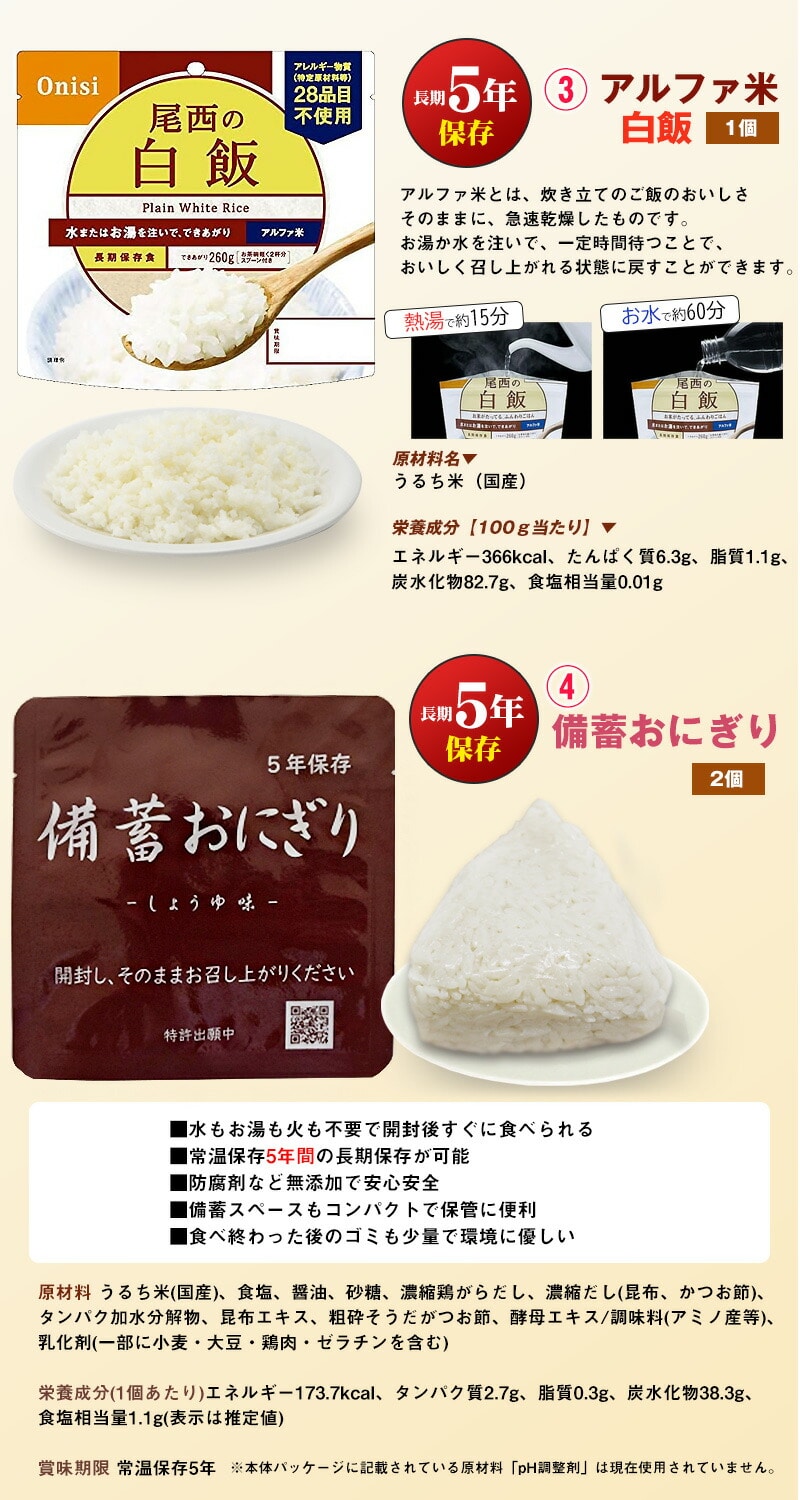 ●保存食は、流通の段階で多少のお時間がかかるため、お手元に届く際には賞味期限が5年を切る場合もございます。