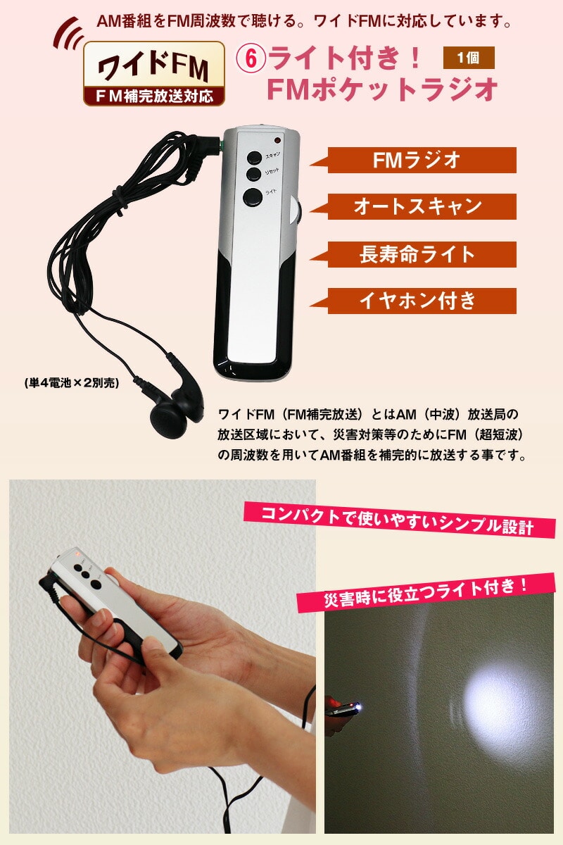 6.ライト付き FMポケットラジオ(単4電池×2本使用/別売)×1個
